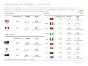 In tutto il mondo lo stile prescelto è ormai quello contemporaneo, che si esprime non solo attraverso linee pulite, ma anche attraverso dimensioni più grandi della stanza da bagno. I giapponesi sono i più propensi a questo tipo di intervento (40% vs. 21%-34% negli altri Paesi) e docce extra-large (con percentuali più basse in Giappone e Russia, rispettivamente 19% e 22%, rispetto al 42%-72% negli altri Paesi).