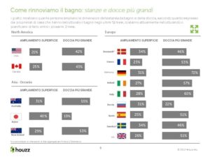 Se parliamo di curiosità, una menzione speciale va al Giappone per essere il Paese dove i water hi-tech sono più popolari (93% vs. 9%-29% negli altri Paesi), a Spagna e Germania per essere i Paesi dove i piatti doccia a filo pavimento sono i più popolari (60% e 55% vs. 3%-39%). L’Italia spicca invece nella scelta delle finiture: il 75% sceglie il soffione a pioggia o cascata e il 21% sceglie una doccia high tech.