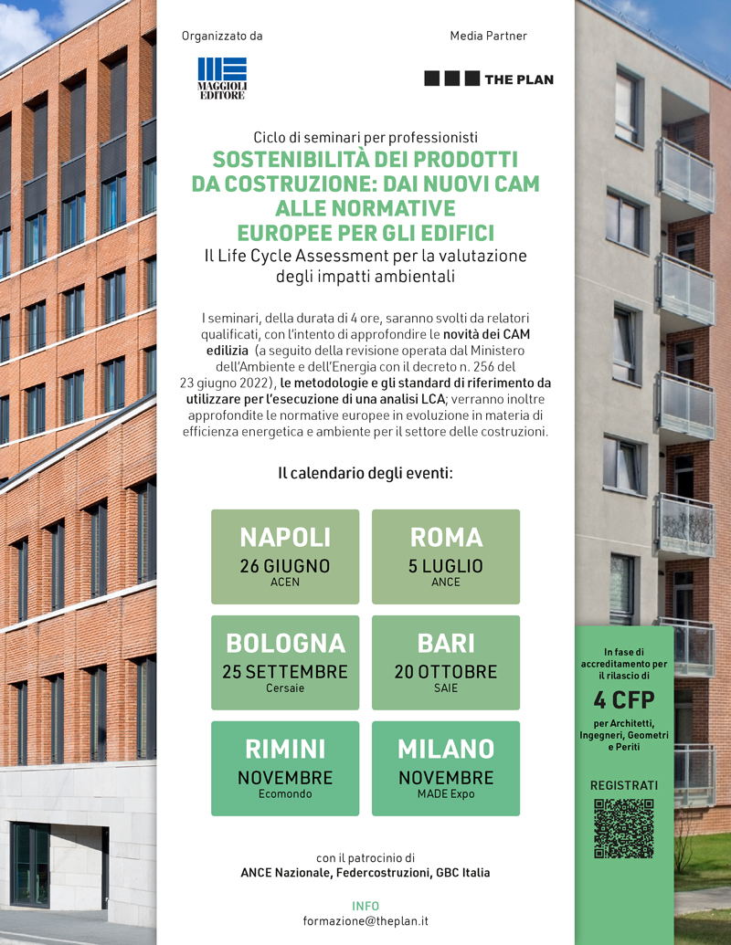 I seminari, “Sostenibilità dei prodotti da costruzione: dai nuovi CAM alle normative europee per gli edifici – il Life Cycle Assessment per la valutazione degli impatti ambientali”, patrocinati da ANCE Nazionale, Federcostruzioni e GBC Italia, prevedono crediti formativi per ingegneri e architetti e sono organizzati da The Plan.
