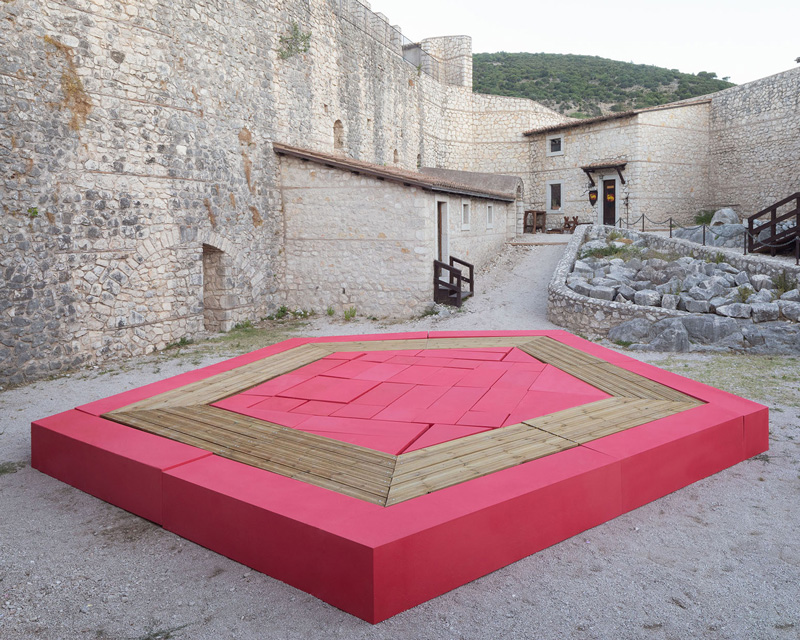 Alessandra: Oltre alla scala urbana, sperimentiamo le nostre idee anche sulle scale più piccole: le installazioni. La Pentana è un progetto che ha vinto l’anno scorso un concorso promosso dal Ministero della Cultura, al fine di costruire spazi di prossimità per progetti di rigenerazione urbana. Abbiamo collaborato con una associazione di giovani che hanno preso in gestione la Rocca Janula a Cassino. Abbiamo disegnato un pentagono, una pedana-palco funzionale per eventi vari, concerti, incontri, rappresentazioni storiche. Si è lavorato con una struttura rigida e con degli elementi mobili che lasciassero libertà d’uso.