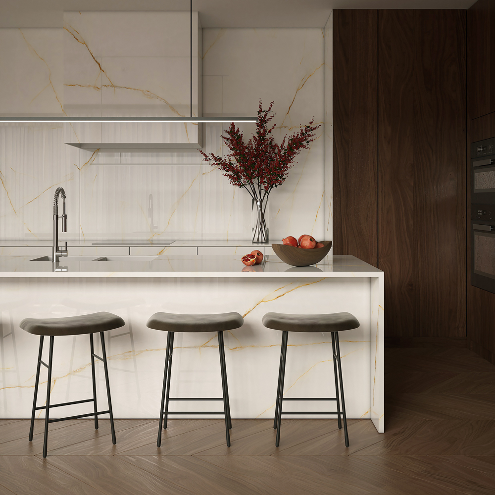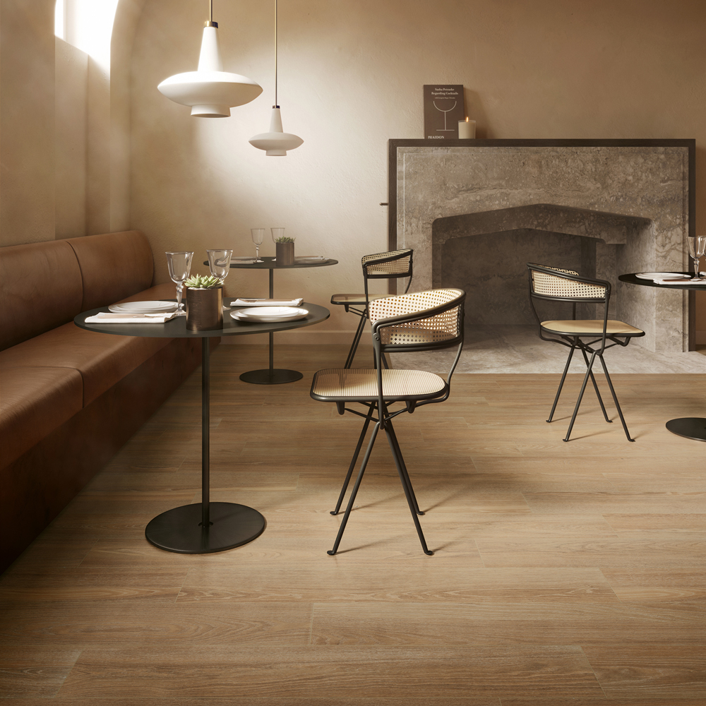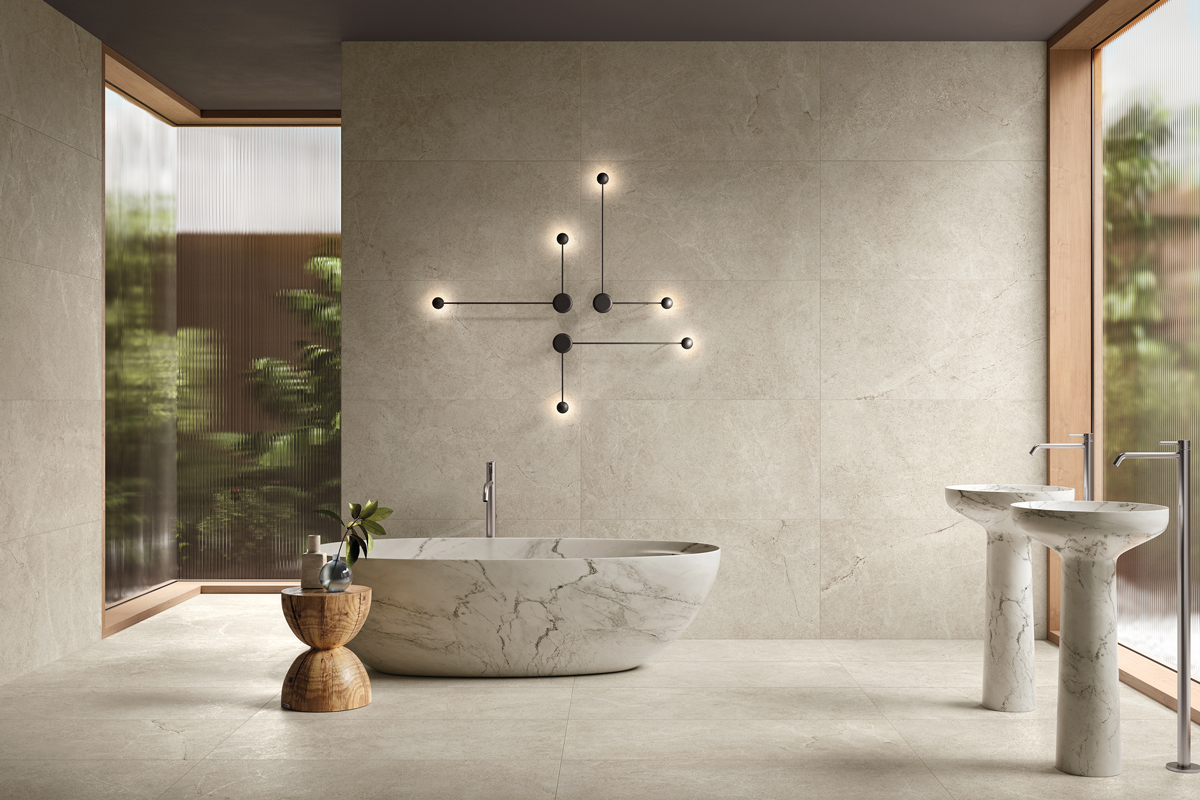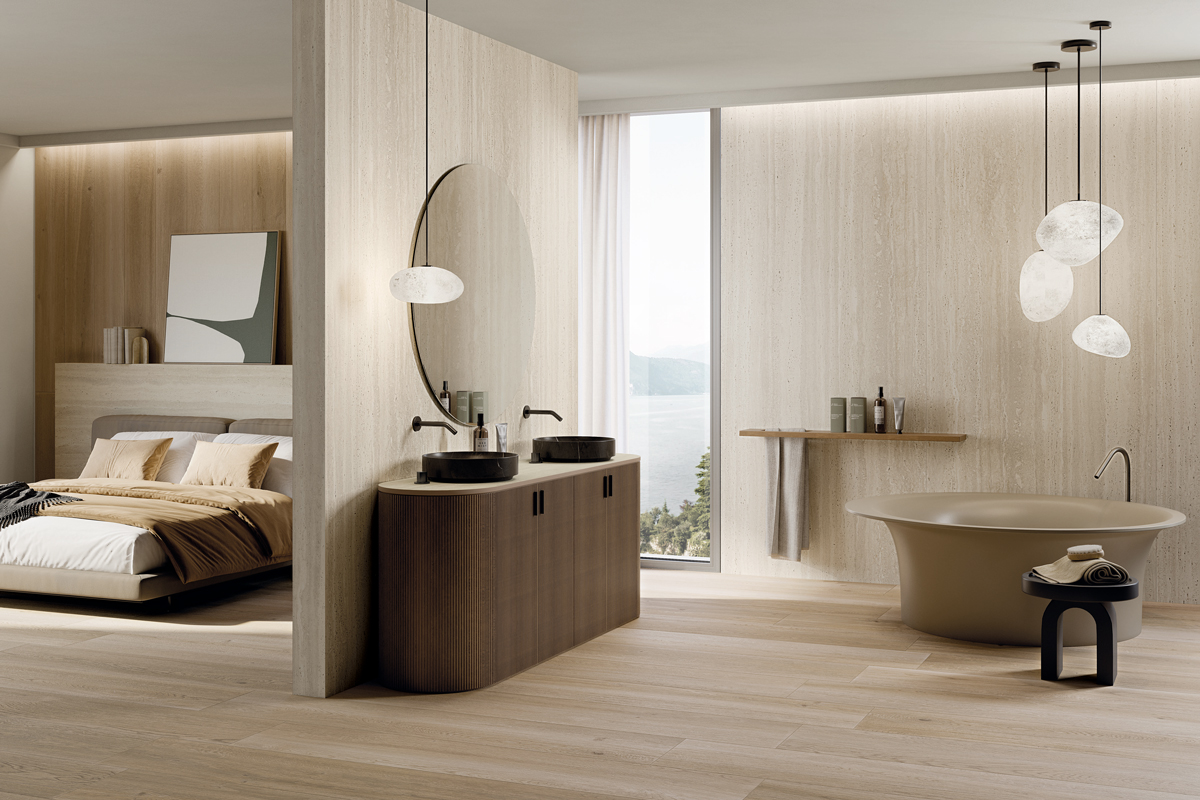 Da un lato, c’è una chiara inclinazione verso la riscoperta dei materiali eterni segno del desiderio di riconnettersi con la terra e la natura. Questa tendenza vede aziende che puntano sull’estetica di materiali come marmi, rocce primordiali, ardesia, limestone, terra, calce e legno con l’obiettivo di creare un’atmosfera autentica e calda, ispirata alla bellezza della natura. Questi materiali vengono spesso riprodotti con precisione grazie a tecnologie di stampa digitale ad alta definizione, che consentono di ottenere dettagli sorprendenti e finiture realistiche.