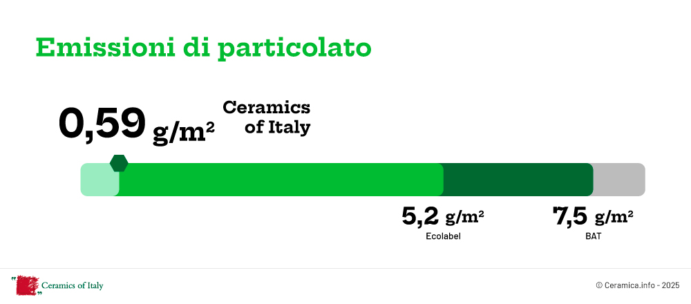 Il valore emissivo medio della Ceramica Italiana relativo al materiale particellare è pari a circa il 92% in meno rispetto a quanto prescritto dalle BAT (Best Available Techniques) di settore. E non è da meno il confronto con la soglia prevista dalla certificazione Ecolabel.