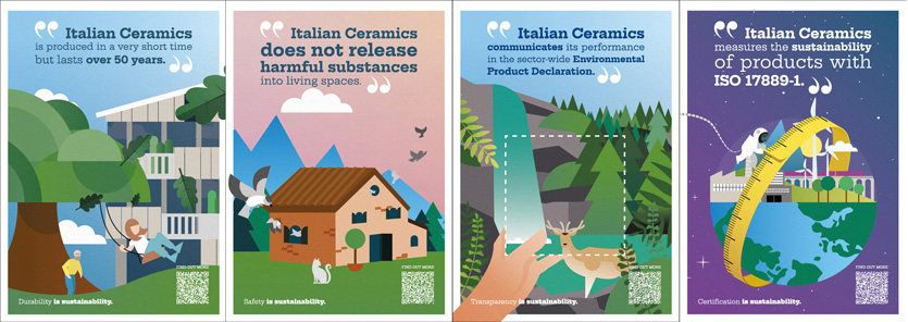 La campagna di comunicazione 2023 si sviluppa in otto soggetti, ciascuno dedicato a un asset della sostenibilità ceramica italiana: riutilizzo dei materiali di scarto, cogenerazione energetica e fotovoltaico, durabilità rispetto ai tempi di produzione, riciclo totale dell’acqua, dichiarazione ambientale di sostenibilità, non-rilascio di sostanze nocive, non-proliferazione di batteri, norma ISO 17889-1. A ciascun tema, è stata abbinata una illustrazione simbolica dal taglio raffinato e “vintage”, ispirata ai maestri dell’illustrazione pubblicitaria italiana e rielaborata in chiave contemporanea.