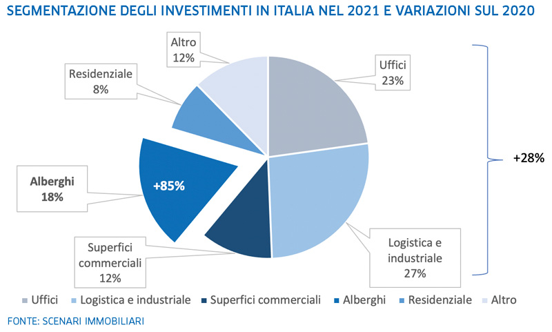 Il mercato turistico si lascia alle spalle i disastri del Covid e riprende a macinare ricavi e investimenti senza lasciare alcun spazio al preventivato calo dei prezzi delle strutture alberghiere che tornano al centro del mercato. In questo comparto, gli investimenti immobiliari mondiali nel 2021 sono più che raddoppiati rispetto al 2020, sfiorando quota 70 miliardi di euro. In Europa il mercato immobiliare alberghiero ha chiuso il 2021 con un fatturato di 21,2 miliardi di euro e si prevede un rialzo a 26,6 miliardi nel 2022. Trend confermato anche in Italia con un fatturato 2021 di 2,5 miliardi di euro che si prevede in aumento nel 2022 a 3,1 miliardi.