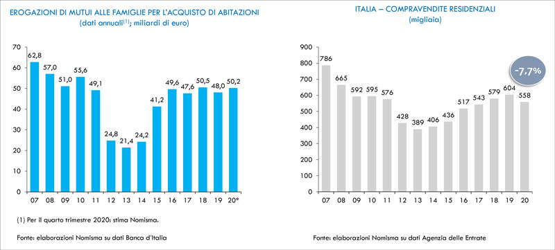 “A fronte di un forte calo del Pil (-8,9%) su base annua e di un peggioramento del clima di fiducia quasi immediato, si registra la pressoché invarianza delle intenzioni d’acquisto immobiliare, rivelatesi quasi immuni rispetto a un contesto particolarmente penalizzante. Probabilmente le famiglie italiane hanno tuttora una percezione diversa della situazione economica generale del Paese e delle ricadute sui propri bilanci familiari”. Così riflette Luca Dondi, amministratore delegato di Nomisma, commentando i dati di un mercato immobiliare nazionale che ha fatto decisamente meglio di quello che era lecito aspettarsi, stante la forte crisi economica frutto della pandemia. Di fatto, assistiamo a una discrasia fra la situazione economica, oggettivamente difficile, e le sue ricadute sui bilanci delle famiglie, attenuate dai provvedimenti di sostegno adottati dal Governo. Questo, probabilmente, è uno degli elementi che ha favorito il mantenimento su livelli elevati delle intenzioni di acquisto, anche in una fase storica di straordinaria difficoltà come l’attuale. Gli altri soggetti coinvolti – operatori economici e istituti di credito – non possono ritenersi altrettanto inconsapevoli ed è proprio la loro fiducia nella ripresa il tratto più sorprendente, che ha contribuito ad alimentare l’esuberanza del settore immobiliare nel 2020, nonostante alcuni segnali d’allarme già avvertiti dalle banche che hanno comunque erogato oltre 50 miliardi di mutui nel 2020 contro i 48 del 2019. “Il risultato di queste dinamiche sul settore immobiliare è sorprendente: -7,7% di compravendite residenziali nel 2020, che si sono spinte a quota 558mila con forte ripresa nella seconda parte dell’anno, è un dato migliore delle previsioni, segno che hanno vinto retaggi di solidità e di sicurezza che spingono le famiglie all’acquisto e le banche a sostenere questa propensione, confidando sulla capacità di recupero della nostra economia”, spiega Luca Dondi. Un altro elemento degno di nota è lo spostamento della domanda verso le località secondarie.