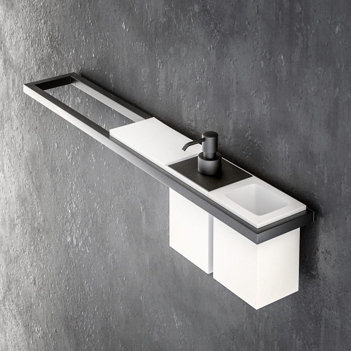 08. Cubic+ è una collezione di accessori di Progetto caratterizzata dalla struttura in ottone, con una speciale finitura matt black, completata da contenitori in solid surface modulabili. Totalmente made in Italy, dal portaspazzolino al dispenser al portasaponetta, la serie risponde a ogni necessità di un selfcare pratico e confortevole.