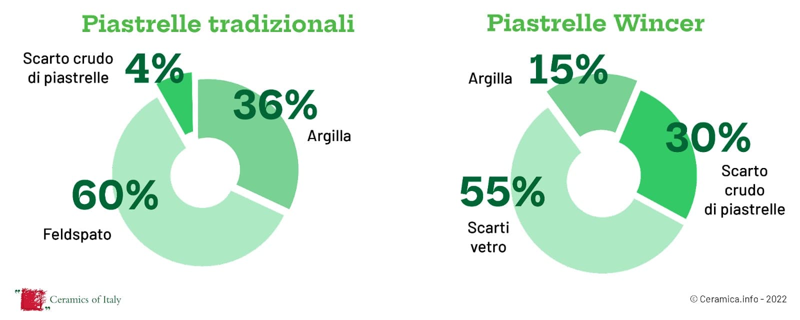 Il 55% delle piastrelle Wincer è costituito da vetro proveniente dalla raccolta differenziata urbana: gli scarti più fini – inferiori ai 100 micron – che non possono essere riutilizzati per la produzione di imballaggi in vetro. Polveri, fanghi e piastrelle rotte prima della fase di cottura rappresentano invece il 30% del prodotto finale.
