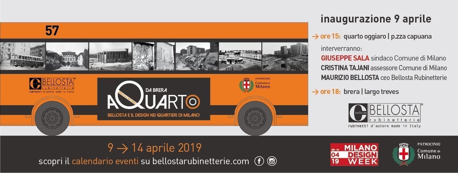 In occasione della Milano Design Week 2019, in programma dal 9 al 14 aprile, Bellosta Rubinetterie, con il patrocinio del Comune di Milano, presenta il progetto “Da Brera aQuarto – andata e ritorno: Bellosta e il design nei quartieri di Milano” un viaggio concettuale, ma anche fisico, da Brera a Quarto Oggiaro, per sottolineare come design e architettura non debbano essere uno strumento elitario di alcuni luoghi della città, quanto piuttosto strumenti al servizio dell’uomo, con una finalità etica oltre che estetica.