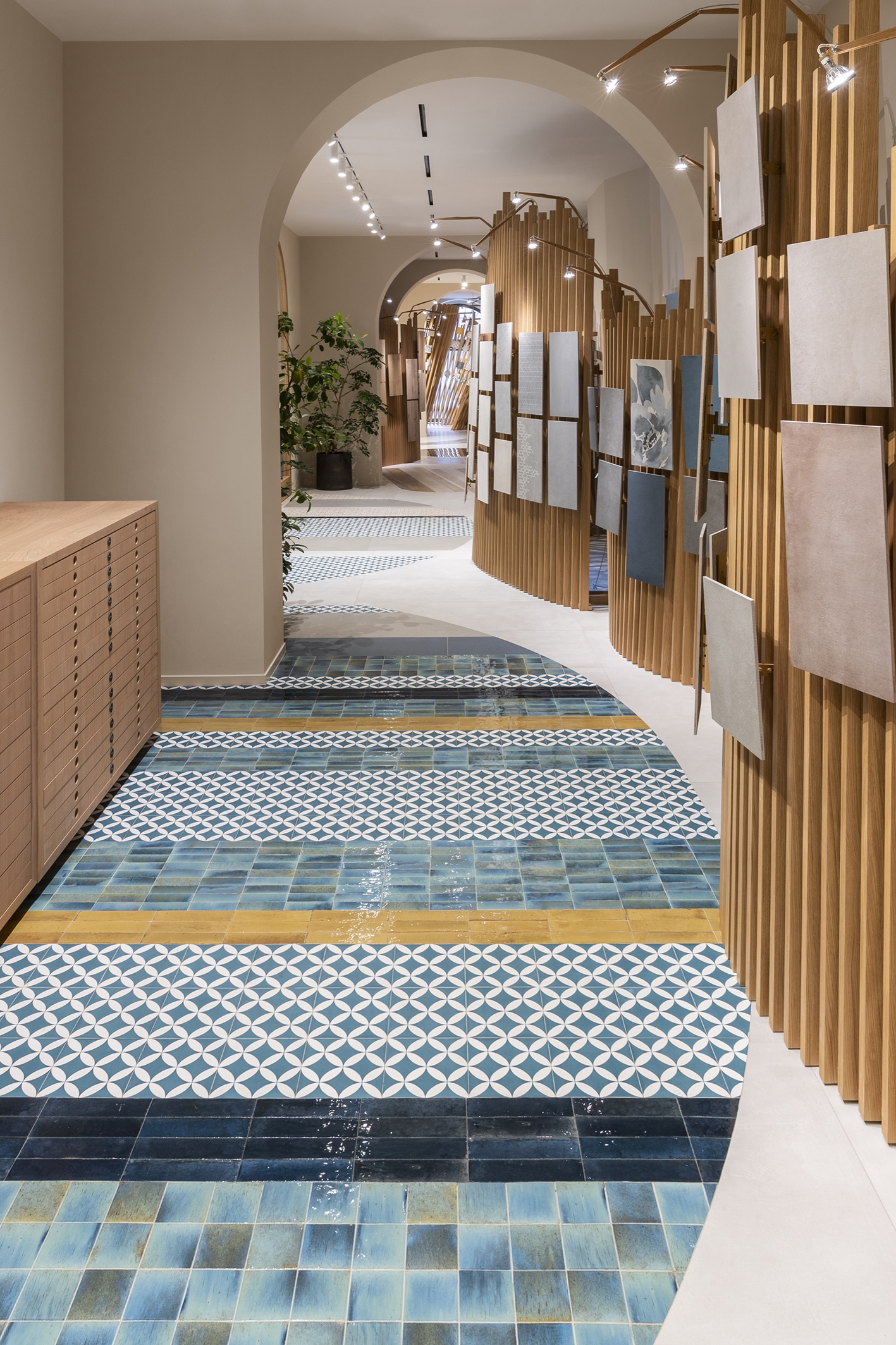 Lo spazio di 400 mq, affacciato con ampie vetrine ad arco su Via Marco Polo, nell’iconico quartiere di Porta Nuova, è stato interpretato da Benedetta Tagliabue come un caleidoscopio di colori, texture e disegni che raccontano in modo sorprendente la storia e le capacità tecniche e artigianali della marca e tutte le potenzialità espressive della ceramica.
