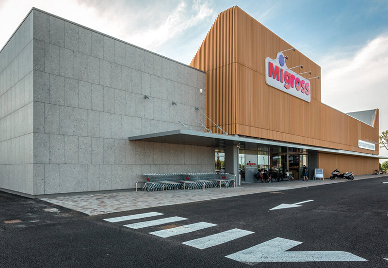 Von der Erfahrung in den Esselunga-Supermärkten von Gardella ausgehend, wo der Supermarkt eine entscheidende Rolle als neuer Servicemittelpunkt für die Stadtviertel spielte, aktualisiert Carlo Alberto Maggiore die architektonische Erscheinung dieser Gewerbeflächen im neuen Flagshipstore der Supermärkte Migross in Bozzolo in der Provinz Mantua weiter.