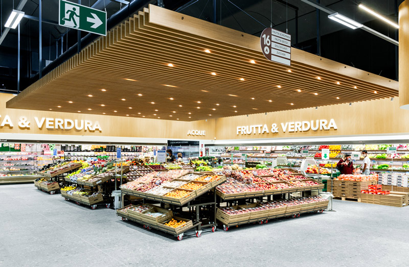 Der neue Superstore wurde erstmals in Bozzolo in der Provinz Mantua umgesetzt. Es handelt sich um ein in verschiedenen Umgebungen wiederholbares und daran anpassbares Format. Die Fertigbaustruktur mit nur vier Säulen im Verkaufsbereich begünstigt die größtmögliche Freiheit bei der Gestaltung, dem Besuch und der visuellen Nutzung der Räume.