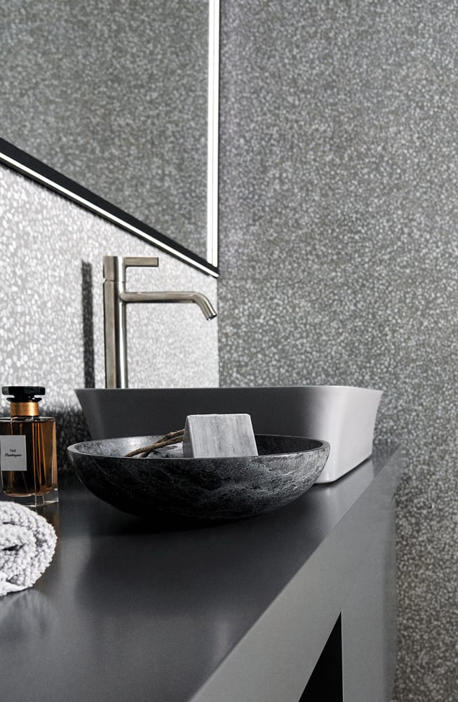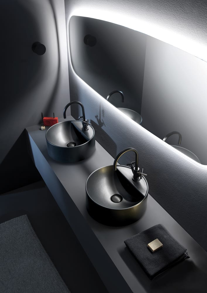 06. Ceramica Flaminia behandelt die Farbe wie einen intrinsischen Projektinhalt und führt mit dem neuen Angebot Carbone, einem intensiven und eindeutig matten Schwarz, eine magnetische Kraft – die der Rückkehr zu den Ursprüngen – in die Badezimmerumgebung ein. Die Prozesswässer der von der Firma erzeugten Keramik werden behandelt und geklärt, um danach wieder in den Produktionszyklus eingeführt zu werden.