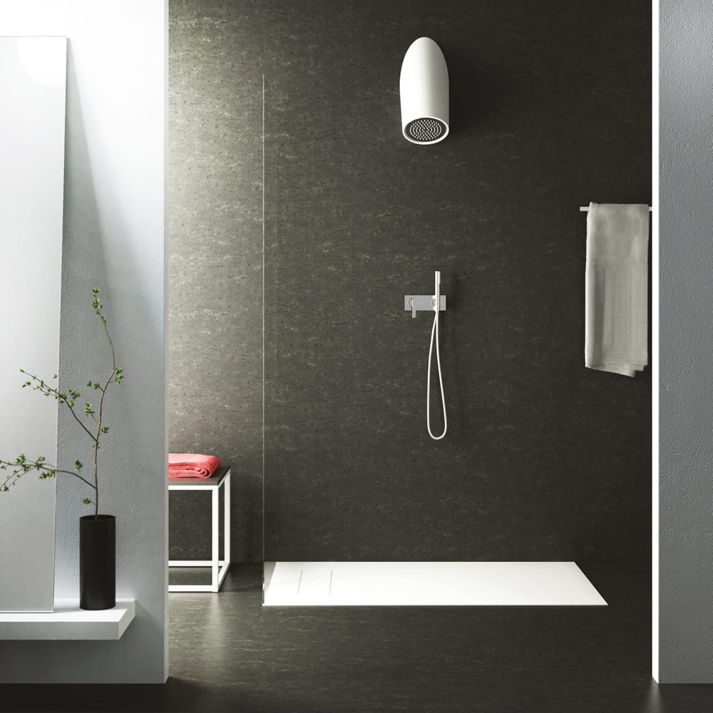 08. Der Duschkopf Estro soft zeichnet sich durch die Diagonale des Wasserstrahls aus, die zur Optimierung des Fließwasserflusses entwickelt wurde. Es handelt sich um ein Projekt von ZeTae Studio für Relax Design, das in Luxolid® Solid Surface gefertigt und in 16 Farben erhältlich ist und somit gut in jede Umgebung passt.