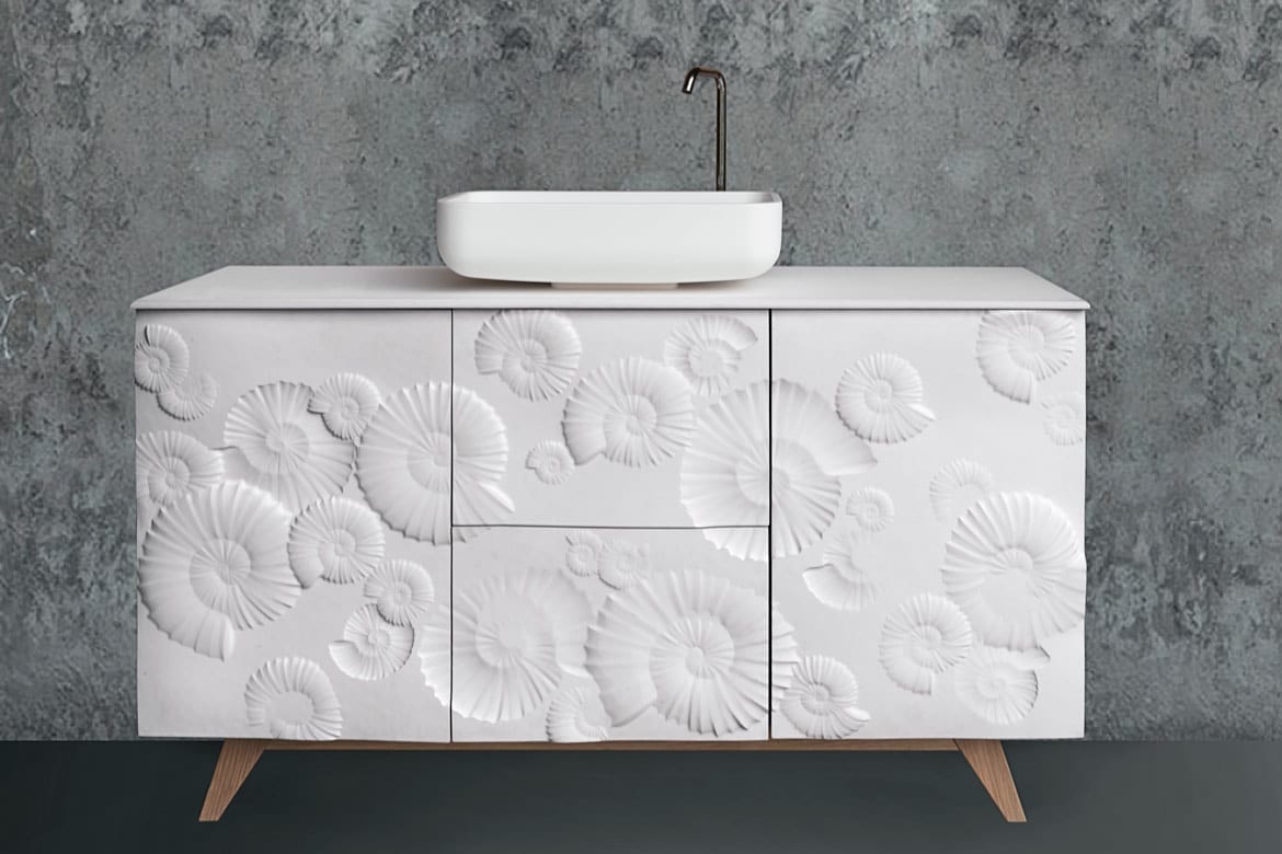 2_Das Badezimmermöbel Ammoniti von Bianchini & Capponi besteht aus Stonelight, Ablage und Waschbecken, mit Intarsien in Fossilienform. Innenbereich aus Natureiche. Türflügel und Laden mit Drucköffnung.