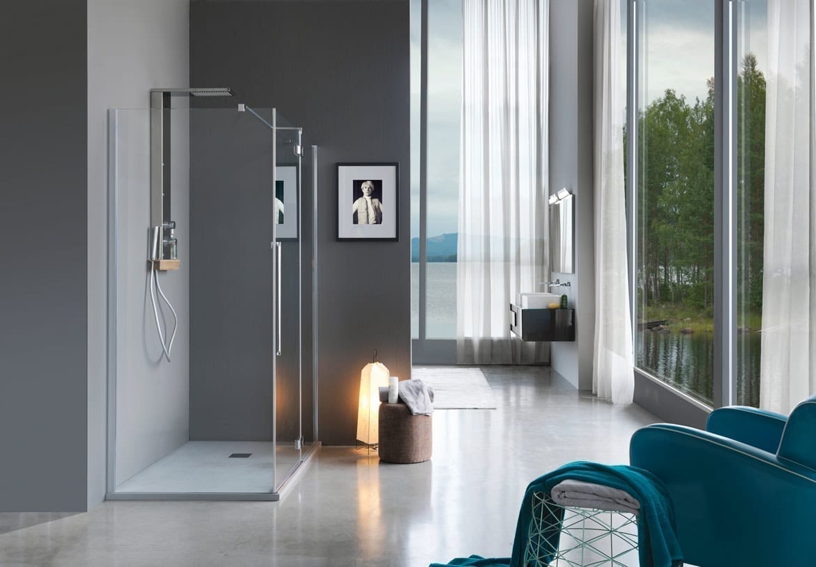 6_Zenith aus der Kollektion Eccelsa von Samo ist eine schlichte Duschkabine mit Gelenkscharnier und Stahlkern, glänzend polierte Chromeinfassung, Magnetverschluss auf der Scheibe, verchromtem Halter oder Halterungset. 90° Schwingtür nach innen und auch nach außen.