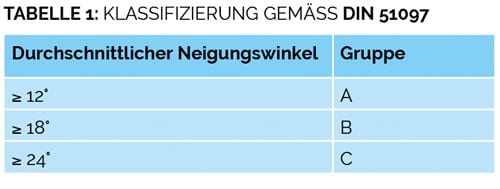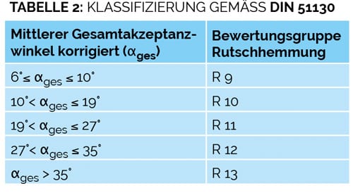 – Bei Bodenbelägen für Arbeitsbereiche und betriebliche Verkehrswege: Die Versuchsperson trägt spezielle Prüfschuhe und die Testfläche ist mit Öl benetzt. Die entsprechende Referenznorm ist DIN 51130, in der 5 Bewertungsgruppen von R9 bis R11 definiert sind (Tabelle 2).