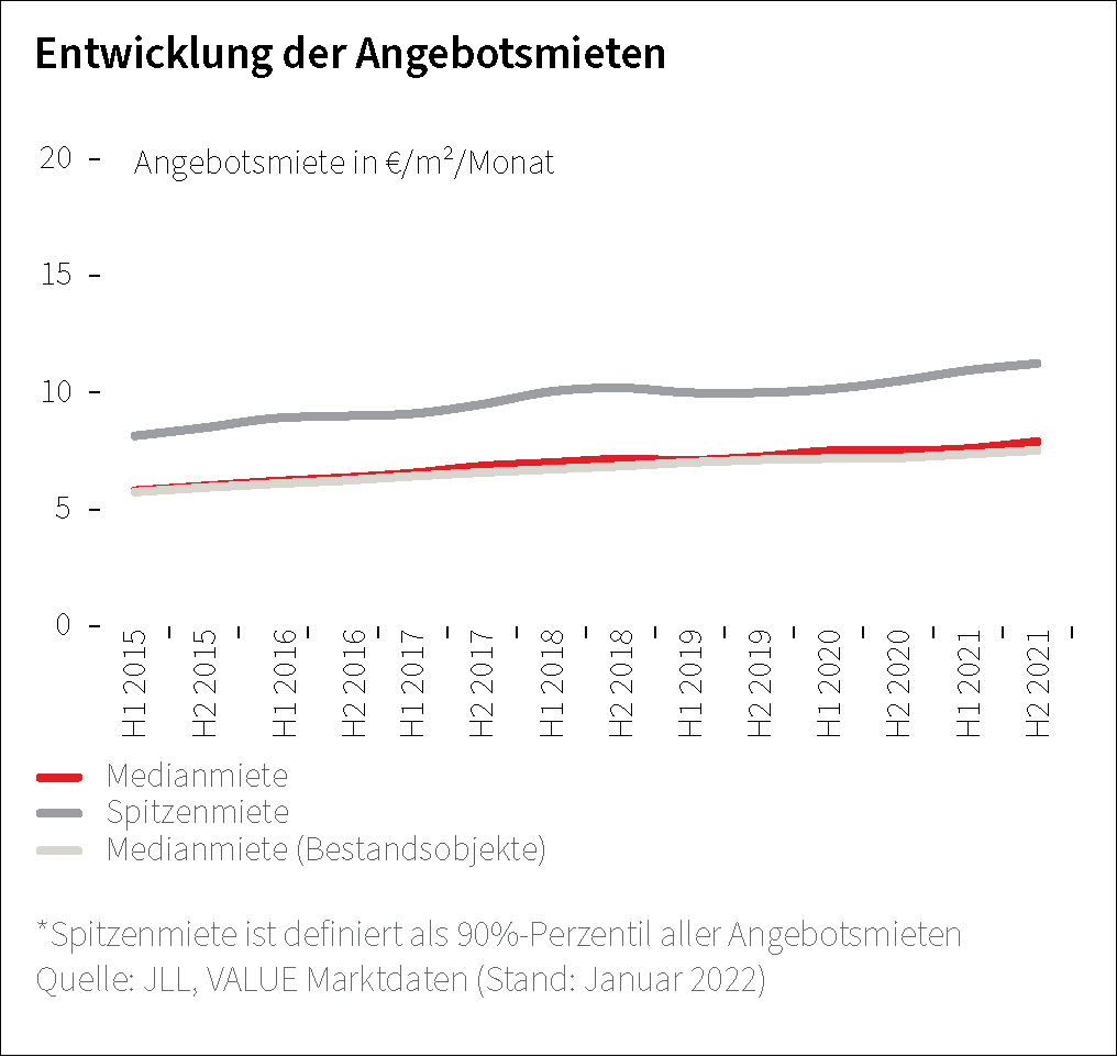 Auch die Mieten werden erhöht: Die durchschnittliche Miete wurde um 3,8 % in der zweiten Hälfte des Jahres 2021 erhöht, was dem Anstieg des Schnitts der letzten fünf Jahre entspricht.