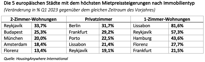 „Schon vor der Pandemie waren die Mietpreise für viele Menschen zu hoch, um so zu leben, wie und wo sie wollten“, sagt Djordy Seelmann, CEO von HousingAnywhere, „und die derzeitige Verlangsamung des Preiswachstums deutet einfach auf eine Rückkehr zum Zustand vor der Pandemie hin, der immer noch durch ein erhebliches Ungleichgewicht zwischen Angebot und Nachfrage gekennzeichnet war. Um die europäische Wohnungskrise zu bewältigen, müssen die Regierungen die strukturelle Angebotsknappheit mit einer ausgewogenen Mischung aus Anreizen und Beschränkungen angehen: Sie müssen handeln, indem sie die Verfügbarkeit, Erschwinglichkeit und Zugänglichkeit von Wohnraum verbessern“. Betrachtet man die Veränderungen gegenüber dem Vorjahr, so zeigt der durchschnittliche Anstieg der Mietpreise um 11,9 Prozent für alle Immobilientypen, dass die Preise immer noch viel höher sind als vor einem Jahr; insbesondere stiegen die Mietpreise für Einzimmerwohnungen um 16,7 Prozent, für Privatzimmer um 10,9 Prozent und für Zweizimmerwohnungen um 7,9 Prozent.