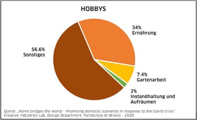 – Practical activities. Zuhause haben 33 % der Menschen mehr Zeit mit ihren Hobbys verbracht: 34 % mit Tätigkeiten im Zusammenhang mit dem Essen, 7,4 % mit Gartenarbeit und 2 % mit der Instandhaltung und dem Aufräumen der Wohnung.