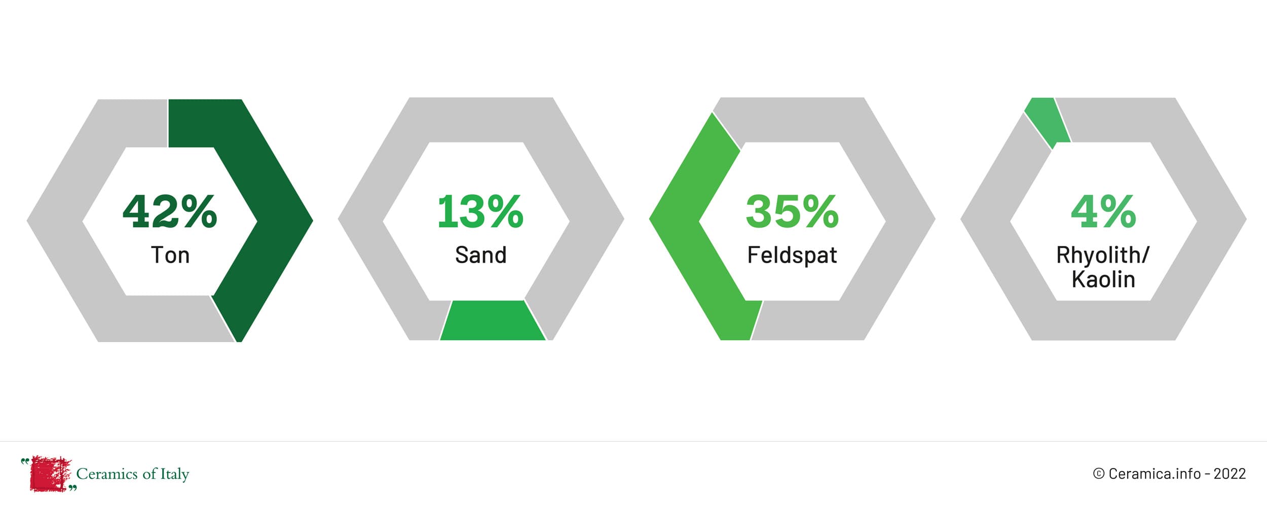 Die italienische Keramik entsteht aus natürlichen Rohstoffen, die trocken gepresst oder mit verschiedenen Strangpressverfahren – und bei der Produktion von Sanitärkeramik durch die Gießtechnik – verarbeitet werden. Ein durchschnittliches Keramikprodukt, das für die gesamte Produktion repräsentativ ist, besteht in erster Linie aus kostbaren Erden und enthält Ton, Feldspat, Sand, Kaolin und andere natürliche Materialien.