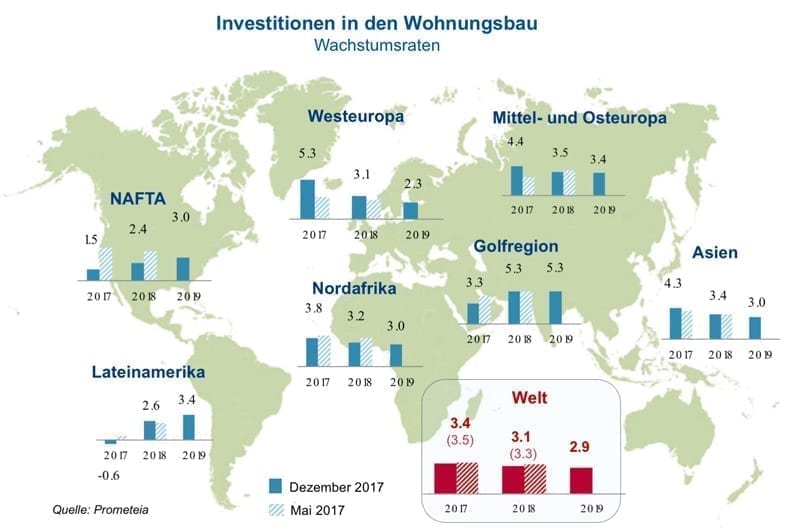 Auf den neuen Märkten deuten die vorläufigen Berechnungen für 2017 auf Wachstumsraten von deutlich über 4%, sowohl für Mittel- und Osteuropa wie auch in Fernost, und übertreffen damit alle Erwartungen. Bei Mittel- und Osteuropa ist dies insbesondere der guten Entwicklung hinsichtlich Investitionen im Wohnungsbau in Tschechien, Ungarn und der Türkei zu verdanken, sowie der Tatsache, dass in Russland, wo der Wohnungsbau langsam wieder anzieht, ein Ende der Rezession in Sicht ist. Auch die Investitionen in Fernost gingen weniger stark zurück als erwartet. Allerdings haben politische Entscheidungen der Regierungen in Indien (Demonetisierung und Steuerreform) und China (langsameres Kreditwachstum) dazu geführt, dass die Wachstumsraten bei den Investitionen im Wohnungsbausektor unter den +4,8% von 2016 lagen.