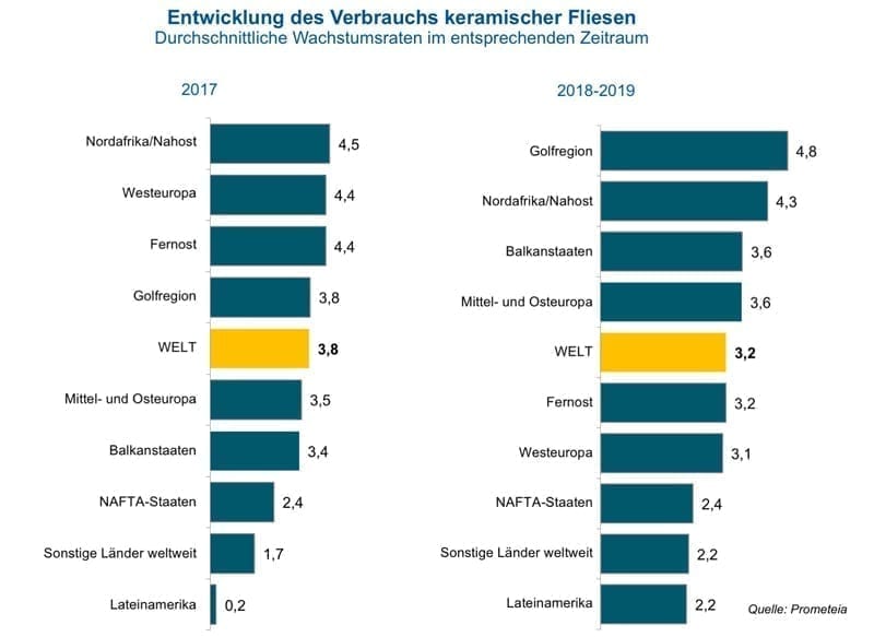 Diese Szenarien mussten Ende 2017 auch auf Grundlage der Nachrichten von den wichtigsten internationalen Märkten sowie hinsichtlich der makroökonomischen Treiber nicht signifikant korrigiert werden. So lässt die Prognose des Forschungsinstituts von Dezember 2017 lediglich durch die Ausweitung des Prognosezeitraums bis 2019 eine Möglichkeit durchscheinen, dass das Wachstum im internationalen Wohnungsbau auf unter 3% zurückgehen könnte, wodurch auch die Nachfrage nach Keramikfliesen unter diese Schwelle zu fallen drohte.