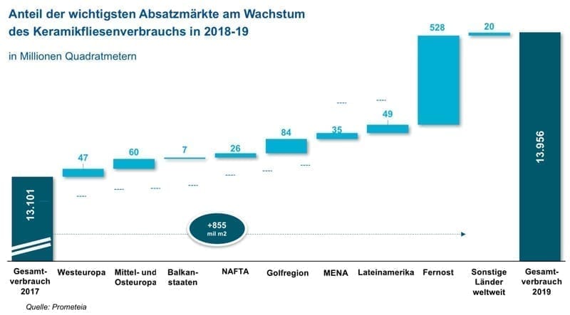 Angesichts der Tatsache, dass die führenden Anbieter von Keramikfliesen weltweit ihre Strategien nicht signifikant ändern dürften, werden 72% dieser marginalen Nachfrage von in den entsprechenden Ländern angesiedelten Herstellern abgedeckt werden. Die verbleibenden 28% (ca. 240 Millionen Quadratmeter) kurbeln den weltweiten Handel der Branche an – und der Importmarkt berührt damit gegen Ende 2019 die Schwelle von 3 Milliarden Quadratmetern.