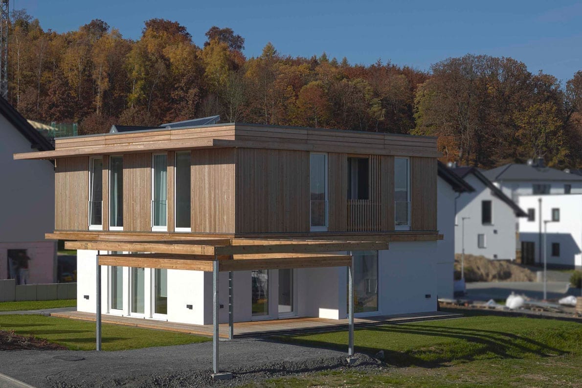 - Butzbach, Einfamilienhaus, „Hybrid-Bauweis“, Massiv- und Holzbau, Blick auf das Gebäudeumfeld (2016)