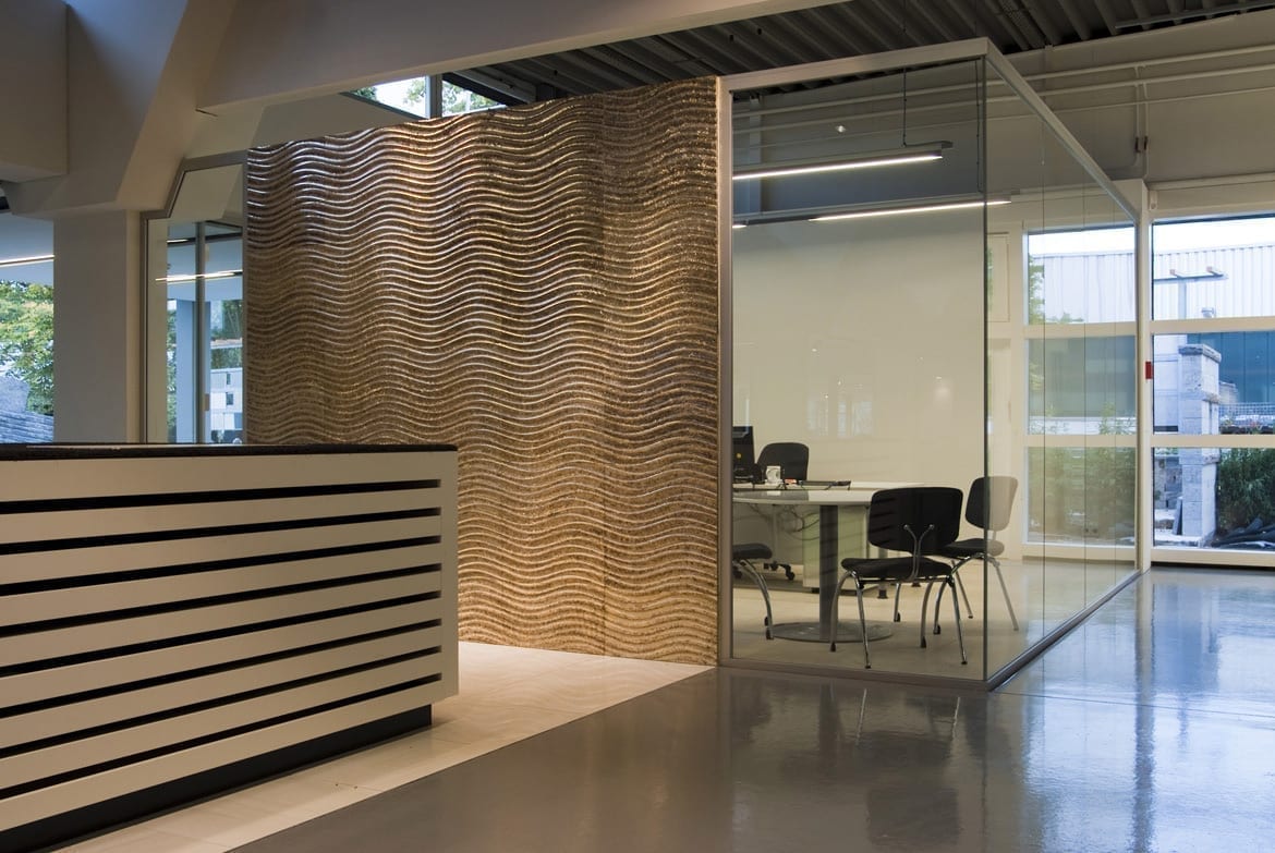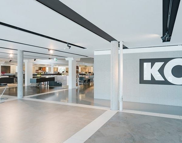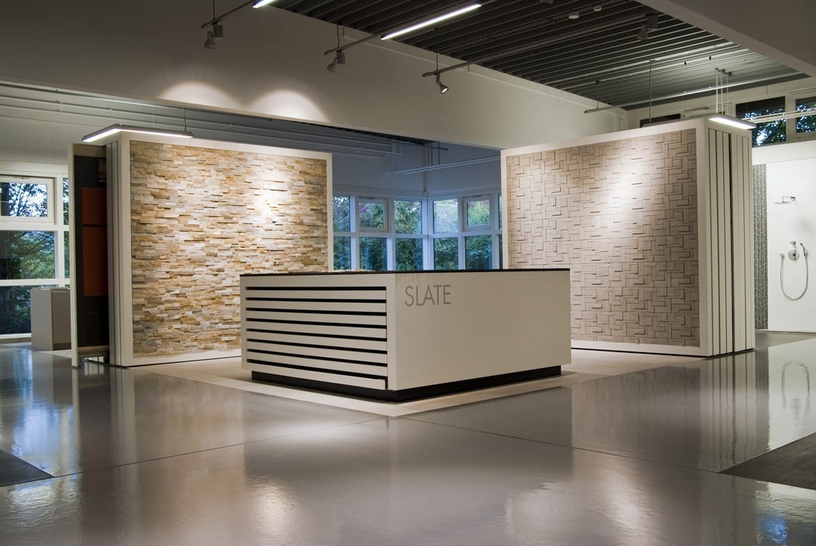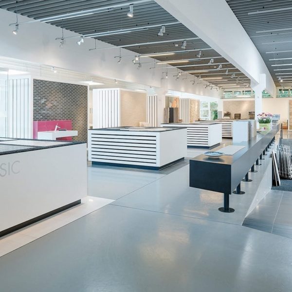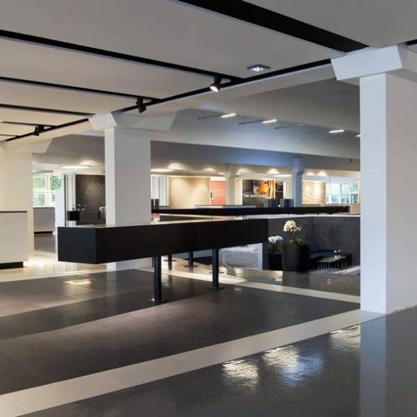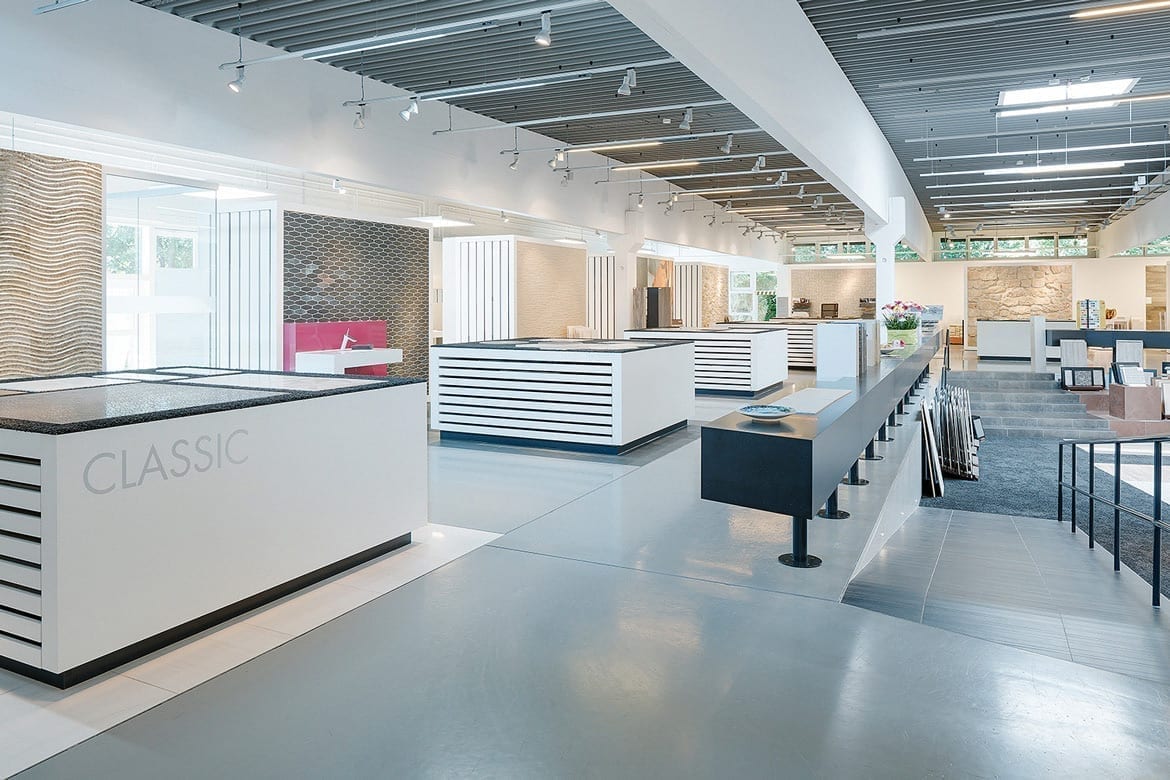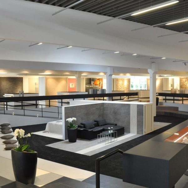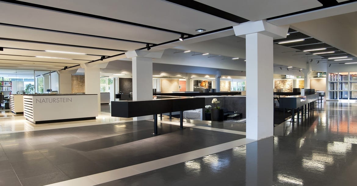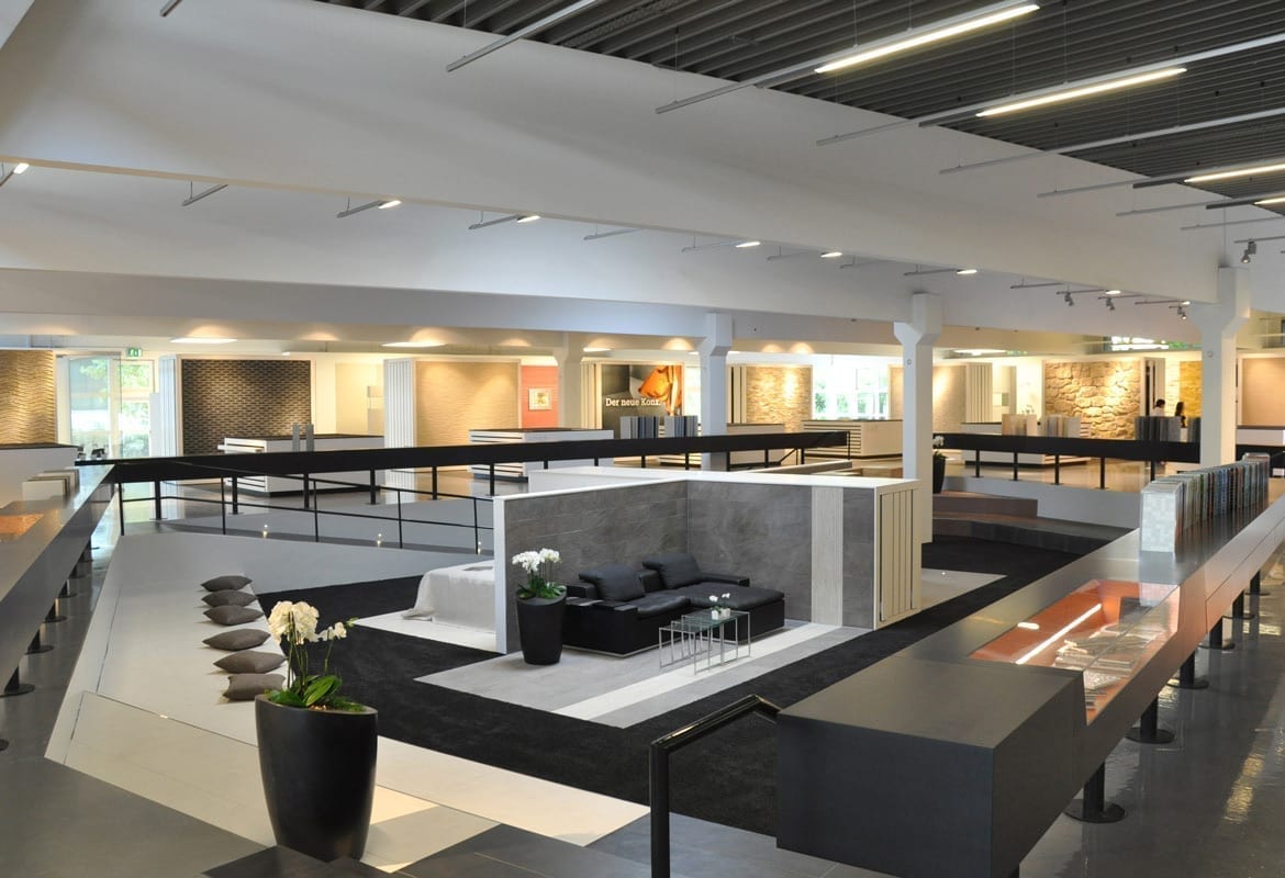 Dieser historische Wachstumsschritt verlangte jedoch ein neues Outfit. Mit dem befreundeten Architekturbüro Space 4 machte sich ein junges Team von Architekten mit Erfahrung im Museums- und Ausstellungsbau ans Werk. Heute verbindet eine offene, lichtdurchflutete Halle die zentralen Geschäftsbereiche Baustoffe, Fliesen und Natursteine in Form einer großzügigen Präsentationsfläche von 2.500 qm Größe.