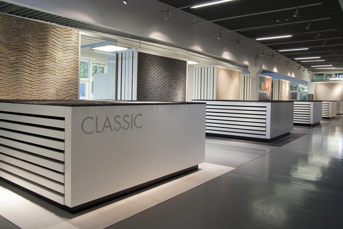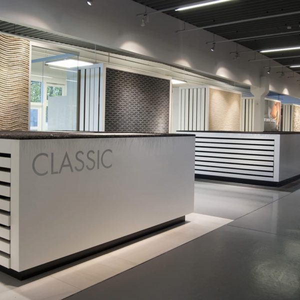 Auch in der Architektur der Fliesenausstellung gingen wir neue Wege. Anstelle der vorkonfektionierten Ausstellungsmöbel, wie es sonst in der Branche üblich ist, wurden Prototypen neuer Fliesenschränke konzipiert und gebaut, die den Anforderungen an die neuen großformatigen Fliesen und Natursteine hinsichtlich Gewicht und ästhetischem Anspruch genügen.