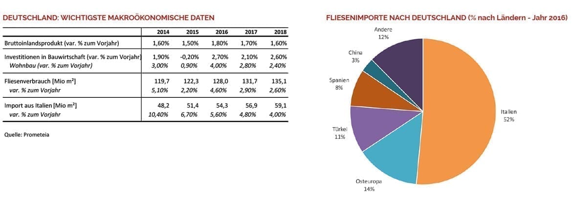 Den gleichen Verlauf und Trend hat auch der Absatzmarkt für Keramik in Deutschland. Der Verbrauch ist 2016 um 5,7 Millionen Quadratmeter auf 128 Millionen Quadratmeter kräftig gestiegen. Die italienischen Keramikhersteller haben diesen Wachstumstrend genutzt und stellen nun mehr als die Hälfte der deutschen Importe mit 51,4% im Jahr 2016. Das entspricht 54,3 Millionen Quadratmeter auf ein Gesamtimportvolumen nach Deutschland von 105,5 Millionen Quadratmeter. Deutschland importiert 82% des Bedarfs an Keramik aus dem Ausland und italienische Keramik behauptet damit ihre traditionelle Vormachtstellung auf ihrem Hauptabsatzmarkt, in den 16,4% des italienischen Produktionsvolumens fließen. Den Wettbewerb aus Osteuropa, der Türkei und Spanien lässt Italien damit weit hinter sich. Betrachtet man die Prognosen der Analysten so steht ein weiterer Anstieg im Verbrauch italienischer Keramikfliesen in Aussicht, auch wenn weniger stark. Erwartet wird ein Volumen von 135 Millionen Quadratmeter und damit liegt es in der Natur der Sache, dass italienische Exporte weiterhin steigen und knapp 60 Millionen Quadratmetern erreichen werden – um genau zu sein, werden 59,1 Millionen prognostiziert mit einem Anstieg von 4%. Das sind beeindruckende Ergebnisse, wenn man sie in Relation der gesamten italienischen Produktion sieht; so gesehen, belaufen sich die Exporte nach Deutschland auf „nur“ 9% der deutschen Importe.