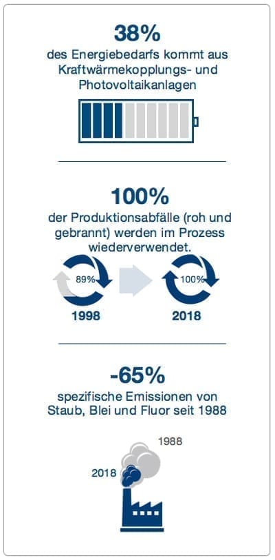 Daten zur Rückgewinnung von Prozesswasser zeigen, dass das Engagement in diese Richtung hoch ist: 97% der Werke leiten keine Abwasser ab und reduzieren damit das Risiko potentieller Oberflächen- und Grundwasserverschmutzungen. Der Wiederverwendungsfaktor für Produktionsabfälle (roh und gebrannt) beträgt fast 100% (zum Vergleich 89% im Jahr 1998). Für Unternehmen, die Abfälle aus anderen Branchen verwenden (Verbrennungsrückstände, Kathodenstrahlröhren, Glasflaschen, Textilschlamm usw.), liegt der Wert der Kreislaufwirtschaft bei über 100%.