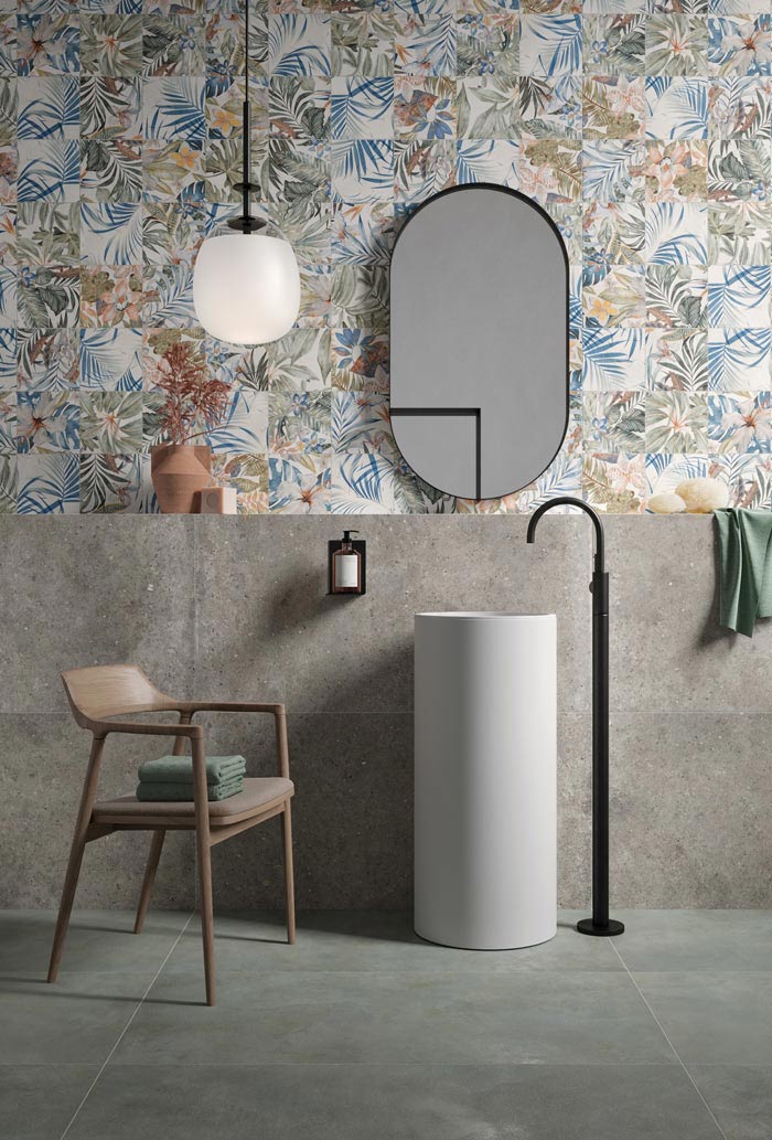 14. Der Unterteil der Wand ist mit Platten der Kollektion Anima verkleidet, die die natürliche Wirkung von Stein in sich vereint. Darüber eine originelle Zusammensetzung, die mit dem Dekorelement Tropicale der Kollektion Luce – weißscherbigem, vollgemischtem Feinsteinzeug im Format 60×120 cm mit 9 mm Stärke – erzielt wird. Der gesamte Vorschlag stammt von Ariana.