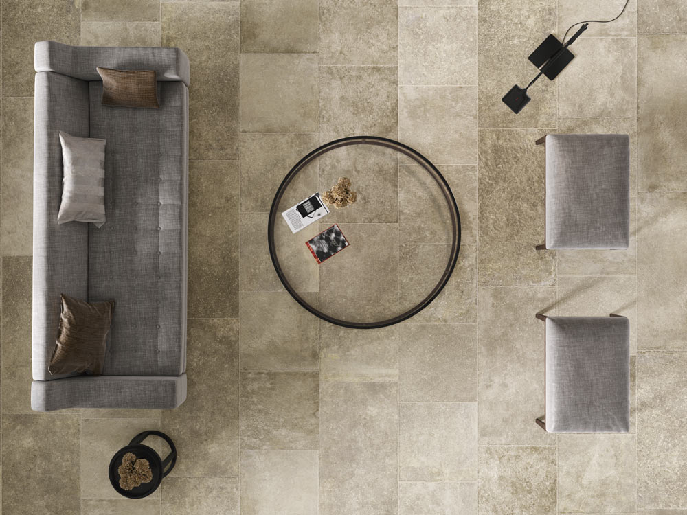 10. Borgo Italiano, die neueste Kollektion von Verde 1999, ist eine eklektischer, aber raffinierter wiederverwerteter Stein. Es handelt sich um einen Stein aus Feinsteinzeug mit rustikalem Rand im Format cm 100×100, der auch in der Version mit rektifiziertem Rand erhältlich ist. Es werden vier neutrale Farben (Ecrù, Perla, Grigio und Grafite) und weitere Abmessungen vorgeschlagen: 60×60 cm und 60×120 cm nur mit trommelpoliertem Rand.