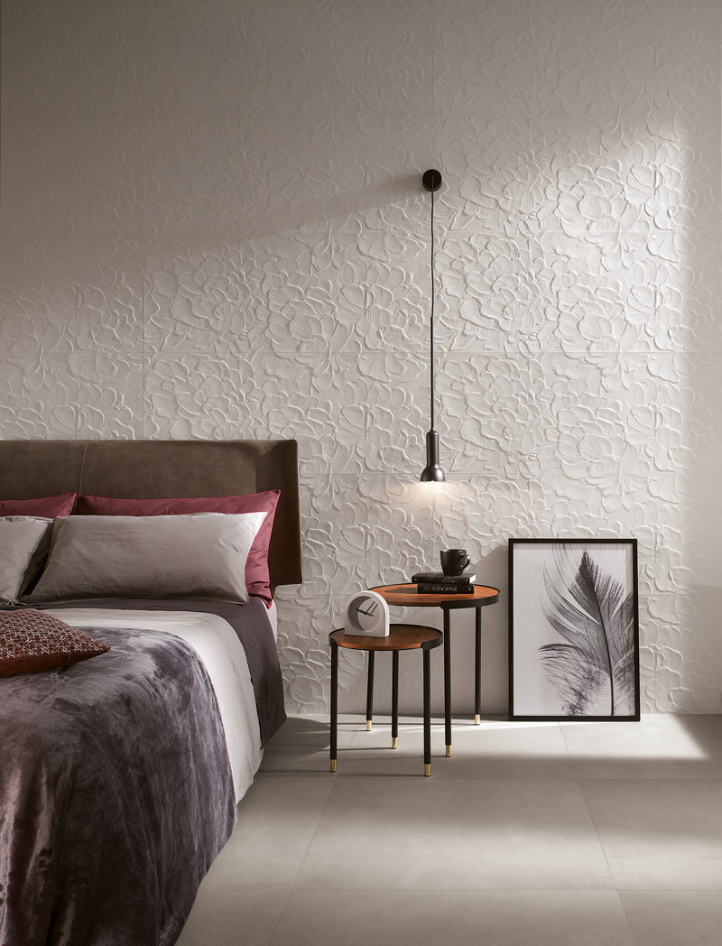 Dank der neuen Materialien, Technologien und Formate der Fliesen können heute Dekorationen jeder Art erzielt werden. Die aktuellsten Trends setzen auf geometrische Muster, zum Beispiel mit dreidimensionaler Wirkung, die die Möglichkeit bieten, persönliche Untergründe und Makromuster, die als Blickpunkt in einem Raum verwendet werden können, zu gestalten.