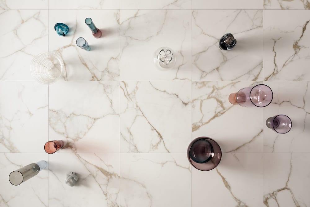 06. Delight von Lea Ceramiche ist ein umfassendes Keramikprojekt, das eine Palette von vier raffinierten Marmorarten (im Bild Calacatta Oro) mit neuen haptischen Eigenschaften in sechs Formaten und mit edlen Dekoren bietet.