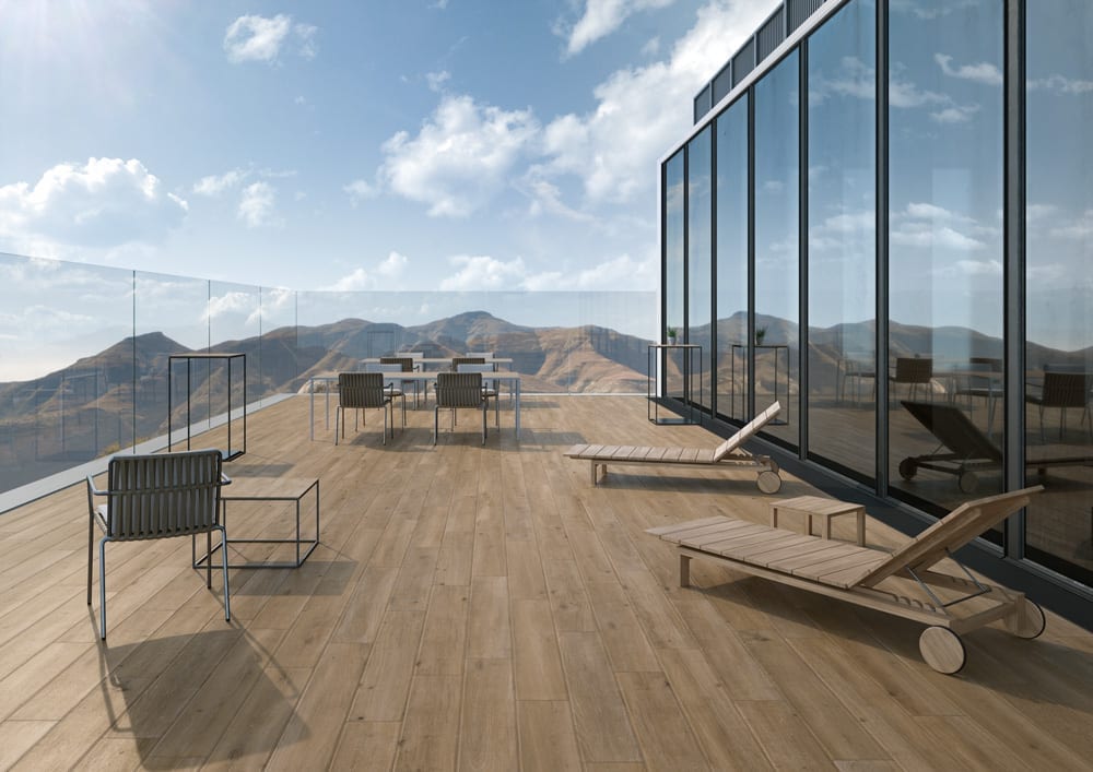 Außenbereiche haben in den letzten Jahren an Bedeutung gewonnen. Zuzuschreiben ist das möglicherweise den immer länger werdenden Zeiträumen mit angenehmen Temperaturen, in denen man sich im Freien aufhalten kann. In neuen Architekturprojekten treten das Draußen und Drinnen verstärkt in einen schlüssigen Dialog, unterstützt durch große Fensterflächen. Deshalb entwickeln immer mehr Hersteller widerstandsfähige, zweckmäßige und haltbare Materialien, die gleichzeitig optisch äußerst bestechend sind. Die Bezugnahme auf die Natur ist weit verbreitet: Oberflächen werden mit Natursteinen kombiniert oder nutzen diese als Inspirationsquelle und reproduzieren sie.