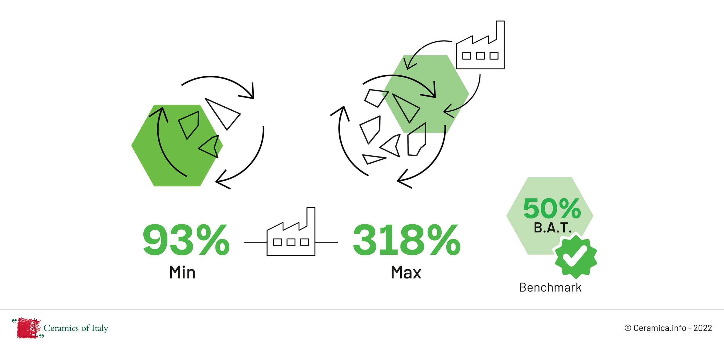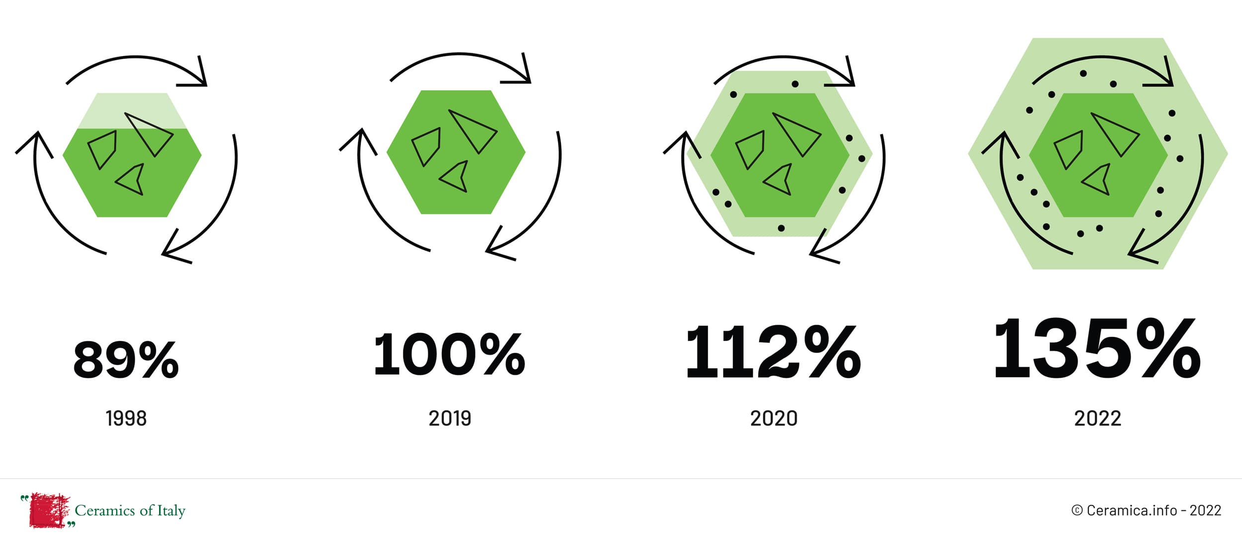 Zwischen 1998 und 2019 haben italienische Hersteller von Fliesen und großformatigen Platten mehr als 600.000 Tonnen Rohstoffe wie Ton und Feldspate pro Jahr eingespart. Im gleichen Zeitraum ist der Anteil an wiederverwendeten rohen wie gebrannten Abfälle von 89 auf 100 % gestiegen.