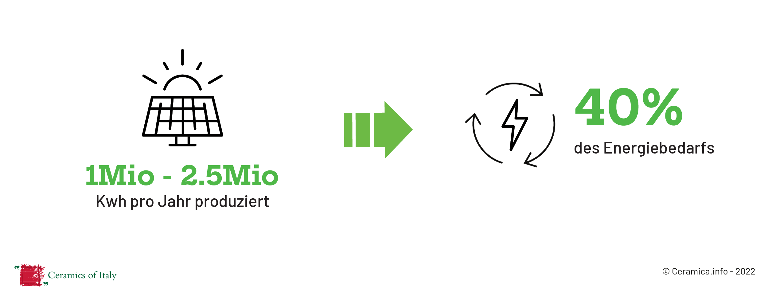 Der Energiebedarf im Keramiksektor ist sehr hoch. Um die Auswirkungen auf die Umwelt zu minimieren, ist die Verbrennung fossiler Brennstoffe zu vermeiden. Zur Bewältigung der Energiekrise investieren die italienischen Unternehmen seit geraumer Zeit in erneuerbare Quellen, und zwar in Form von Photovoltaik-Anlagen, welche die eigenständige Erzeugung sauberer Energie garantieren.