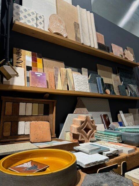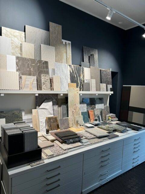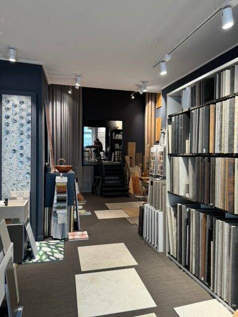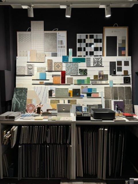Absolute Vielfältigkeit!  Ateliercharakter! Eine Bibliothek des Materials! Wir haben Feinsteinzeug in allen Varianten, Formen und Farben, Handformfliesen, Terracotta, gefräste Oberflächen, Naturstein in seiner absoluten Vielfältigkeit. Wir hören sehr häufig von unseren Kunde‚ wenn ich hier nichts finde, wo dann?