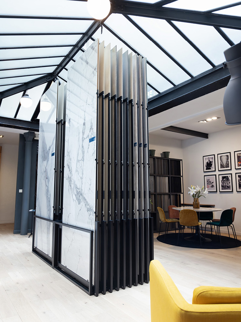 Das Atelier gliedert sich in fünf unterschiedliche Bereiche, die den Besuchern technische und ästhetische Lösungen präsentieren, die die Marke auch in Frankreich berühmt gemacht haben: Neben einer großzügigen Lounge, die die umfangreiche Laminam-Kollektion zeigt, beherbergt der Raum einen Außenfassadenbereich mit den Systemen Laminam 5+ Clip und SP Laminam, einen Bodenbereich für stark frequentierte Flächen, einen offenen Arbeitsbereich mit Materialbibliothek sowie eine voll funktionsfähige Küche, die mit Laminam-Oberflächen verkleidet ist und sich ideal für einen Kaffee oder ein italienisch inspiriertes Frühstück eignet.