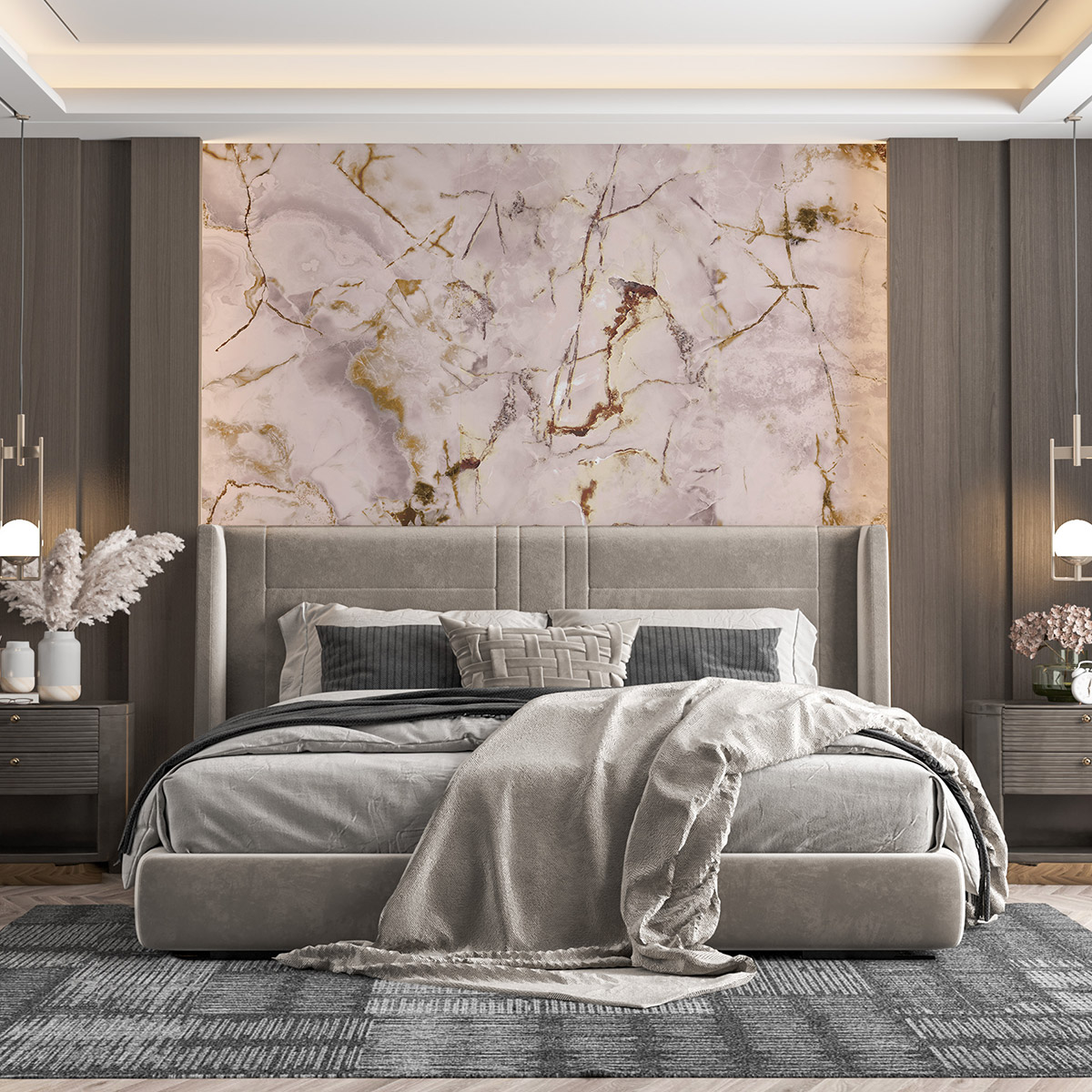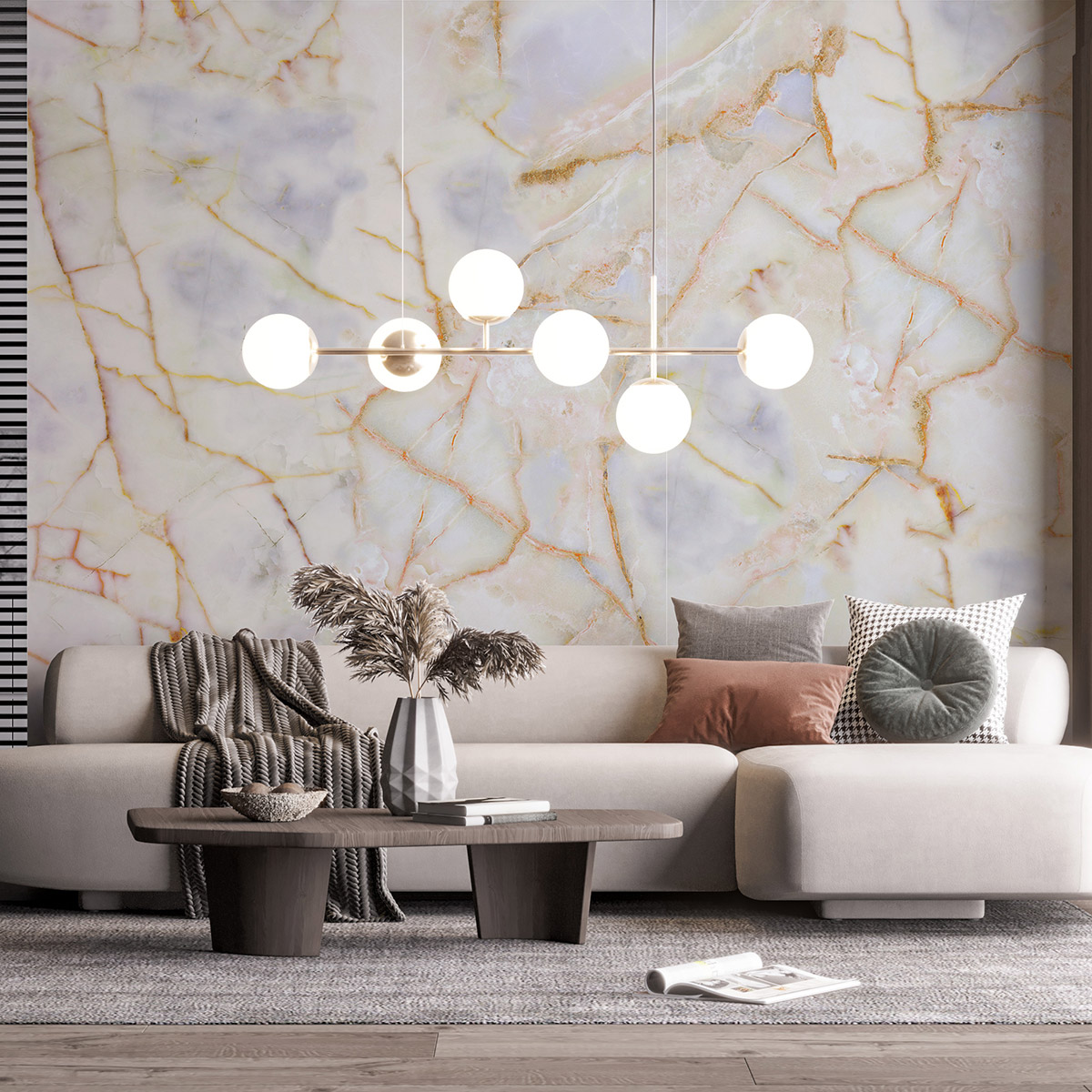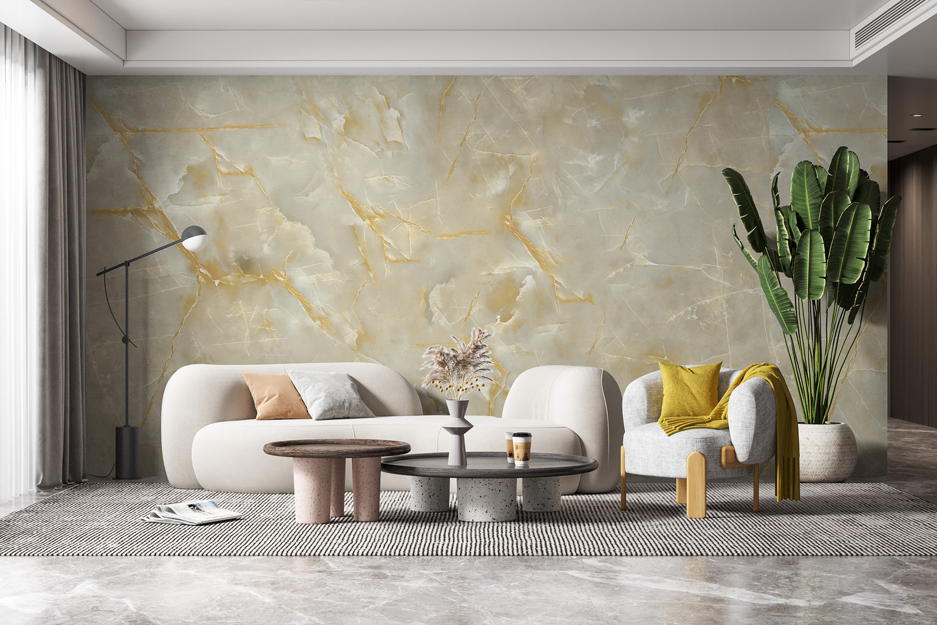 Es ist eine Kollektion, die aus 15 Mustern besteht, die von den Schattierungen und Adern von Kalkstein-Onyx inspiriert sind. Die Farbtöne, mal intensiver, mal zarter, reichen von neutralen Farben wie Weiß, Beige oder Grau bis hin zu brillanteren wie Smaragd, Blau und Gelbgrün.