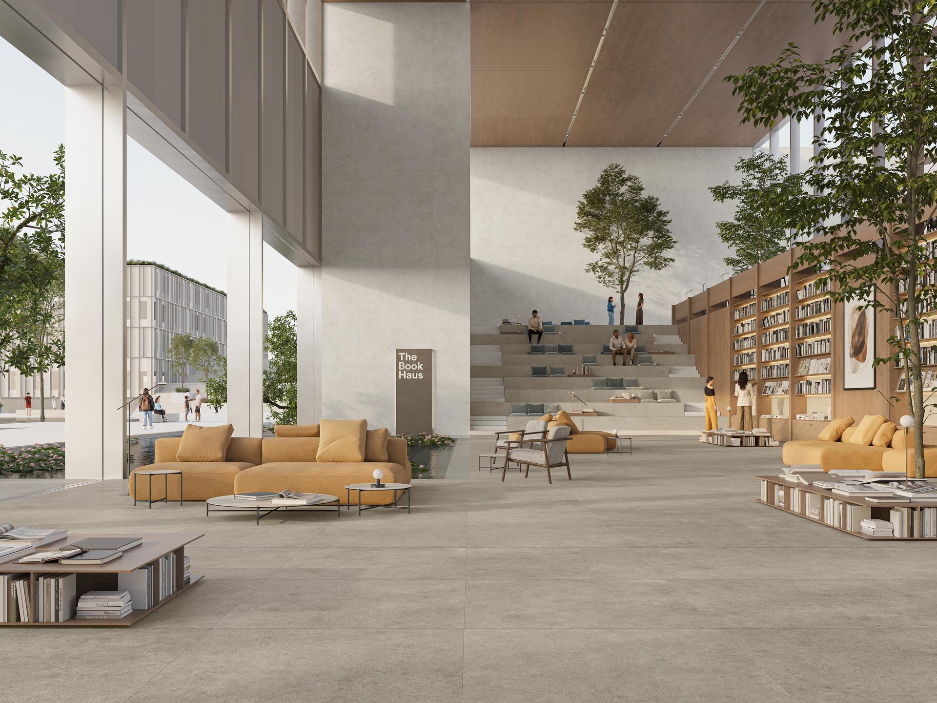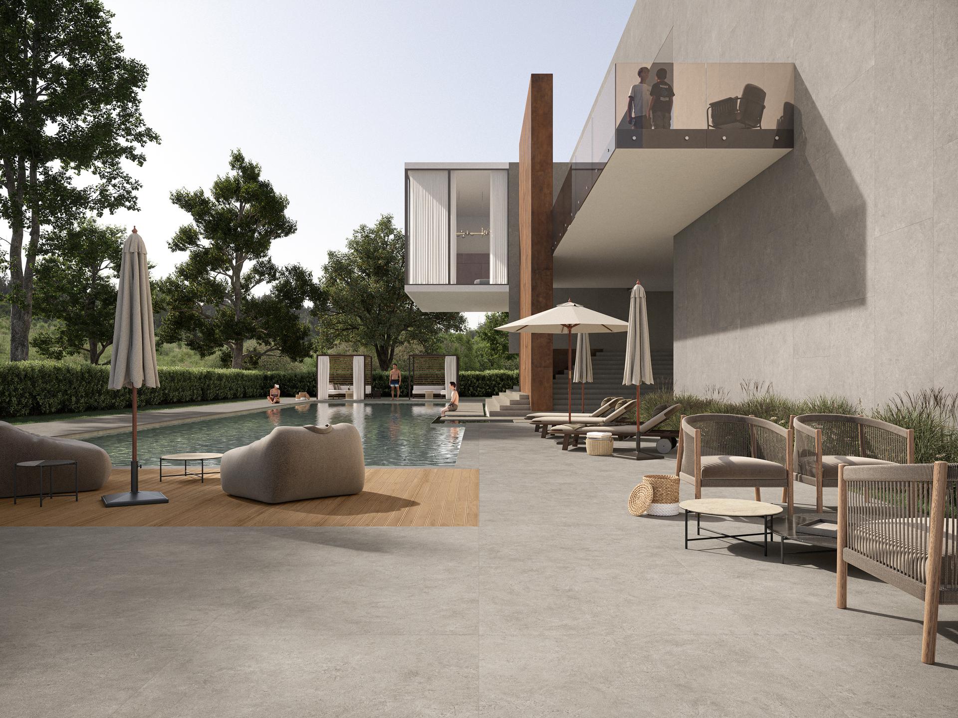 Boost Vision bietet Oberflächen, bei denen Beton und Stein in Kombination mit einer Metalloptik zu einer modernen und zugleich natürlichen Ästhetik verschmelzen, konzipiert für Innen- und Außenbereiche.