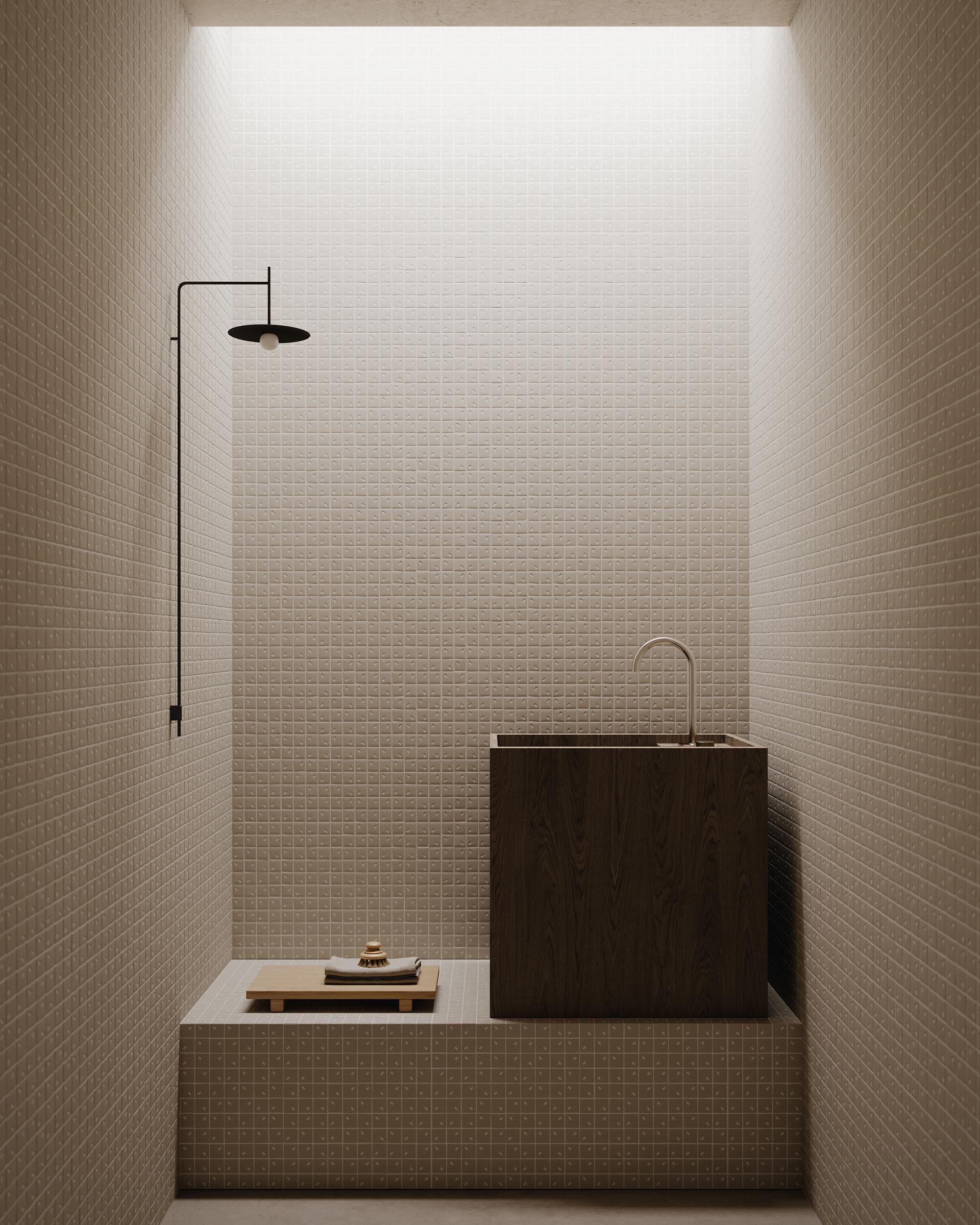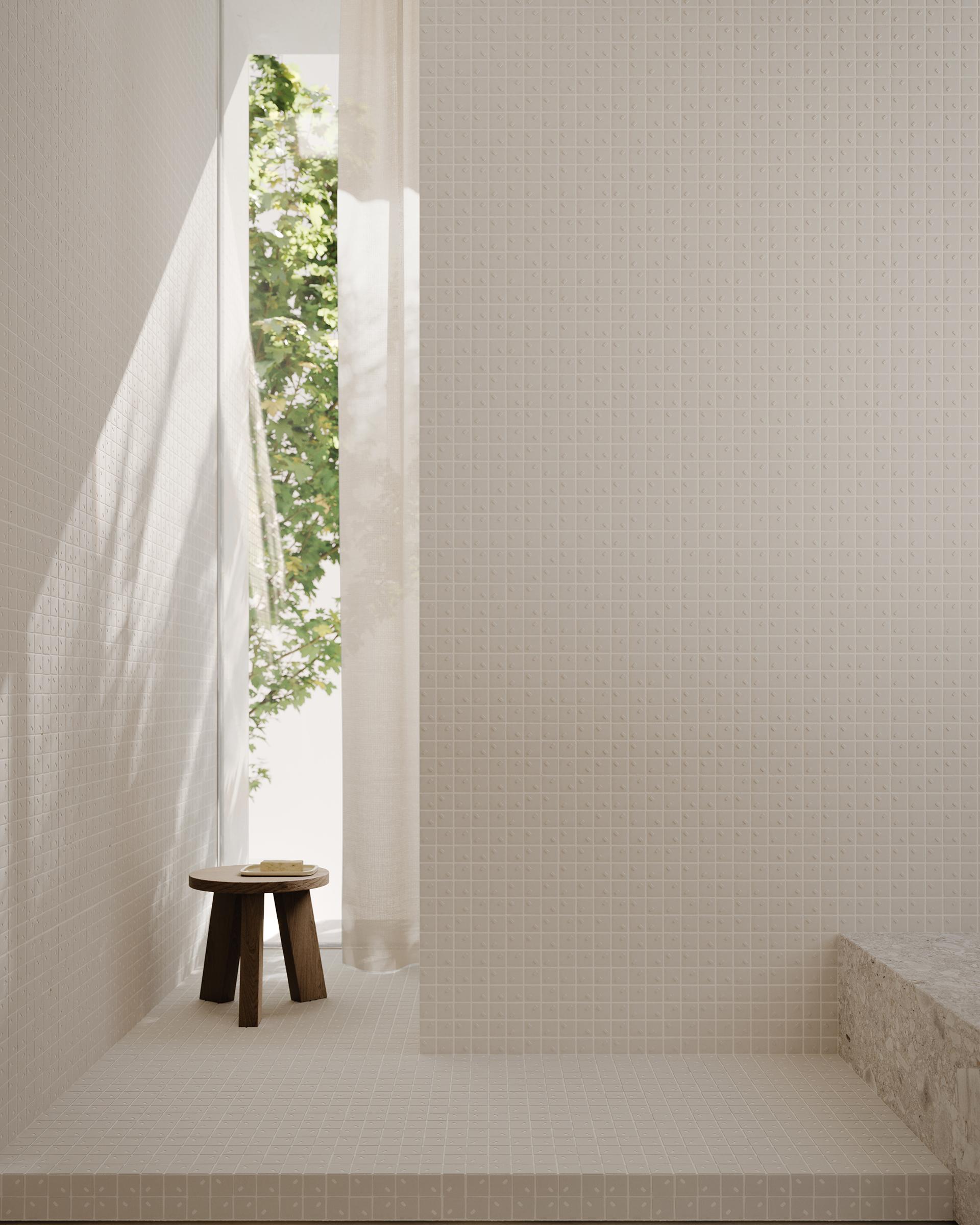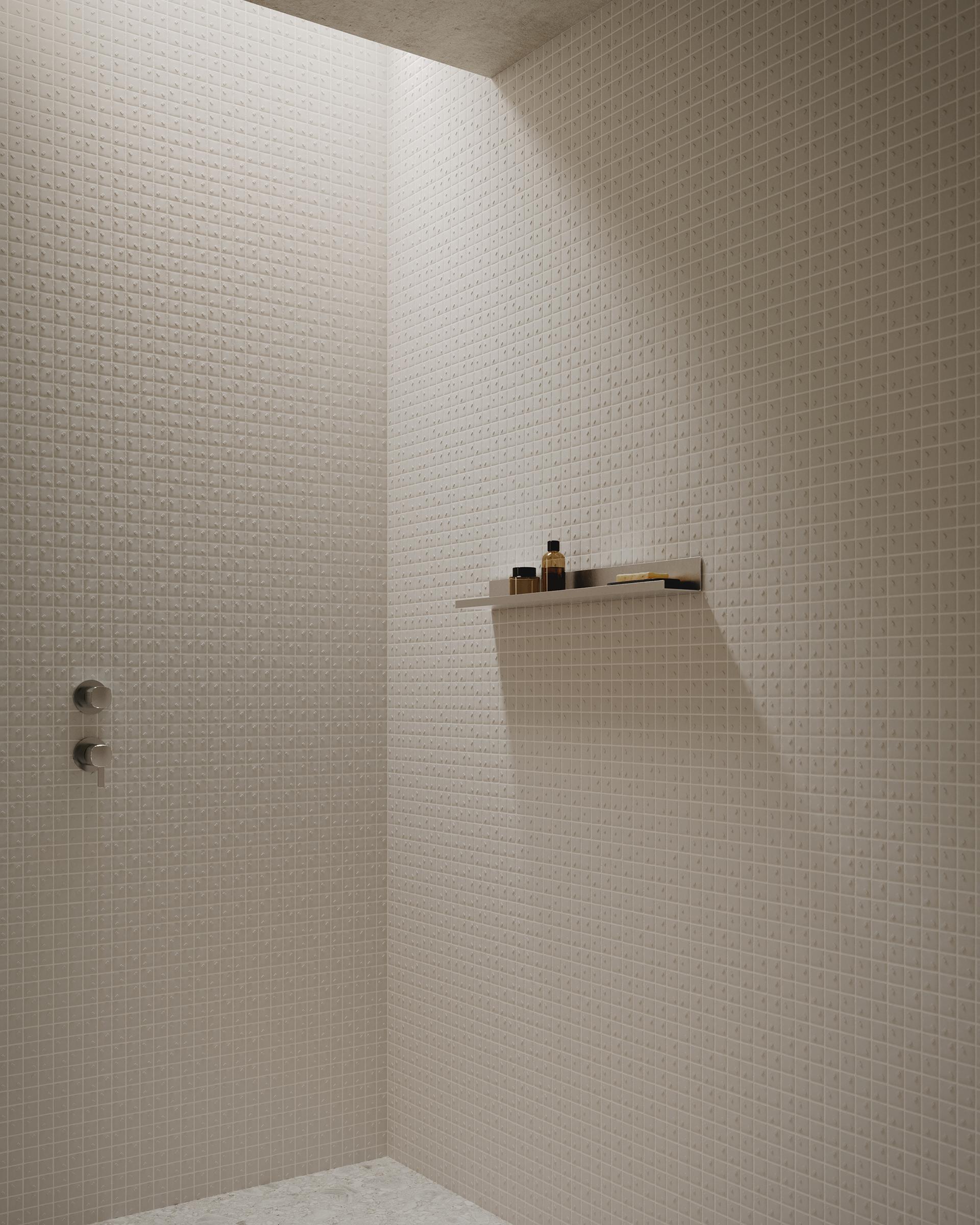 Rain fängt die Essenz der Natur durch ein stilisiertes Design ein. Ein Mosaik, schlicht und zugleich ausdrucksstark, bietet eine neue Interpretation des Themas Regen, mit einem Muster, das je nach Verlegerichtung und Stärke variiert und Kompositionen ermöglicht, die von raffiniertem Minimalismus bis hin zu Lösungen mit starkem künstlerischem Ausdruck reichen.
