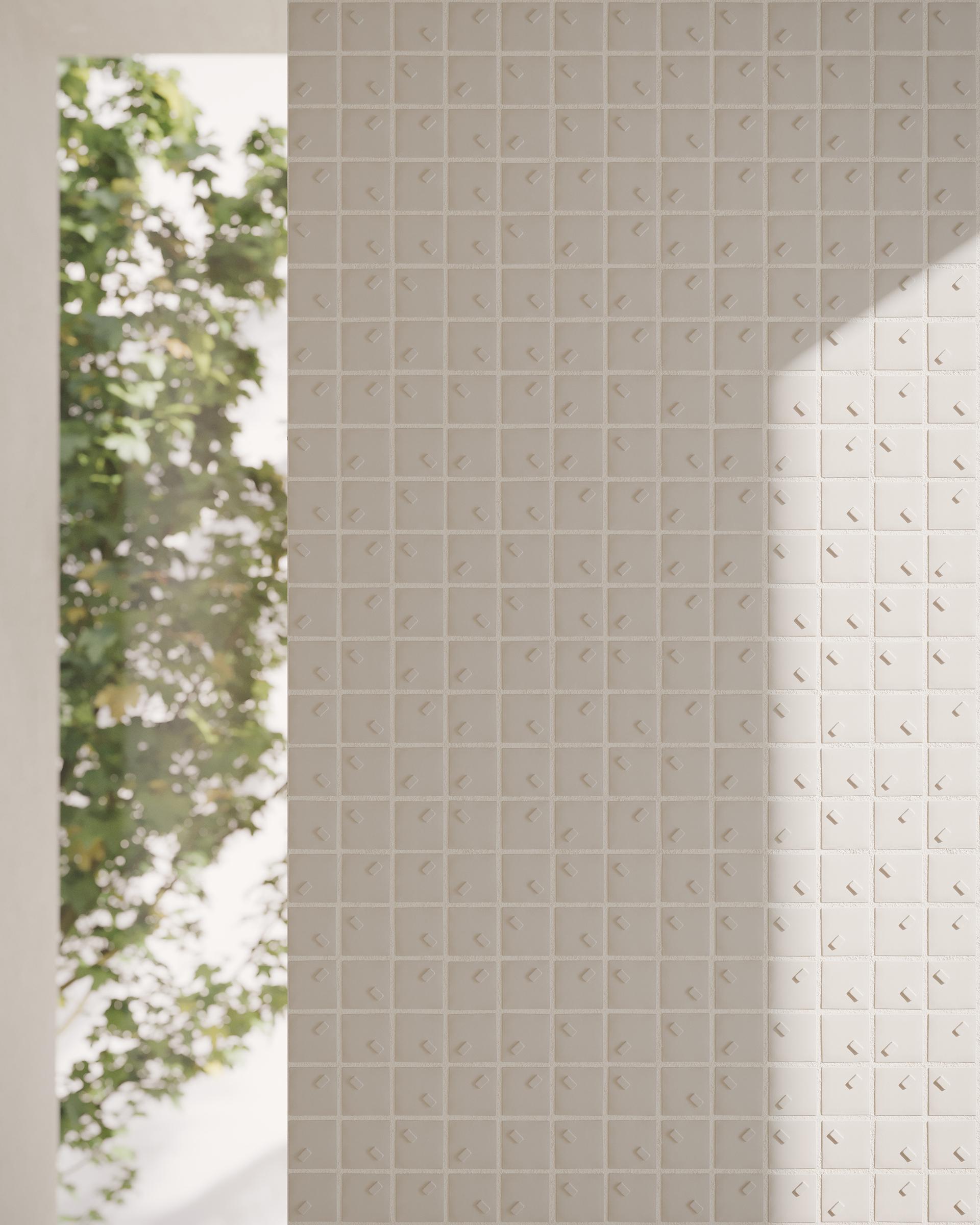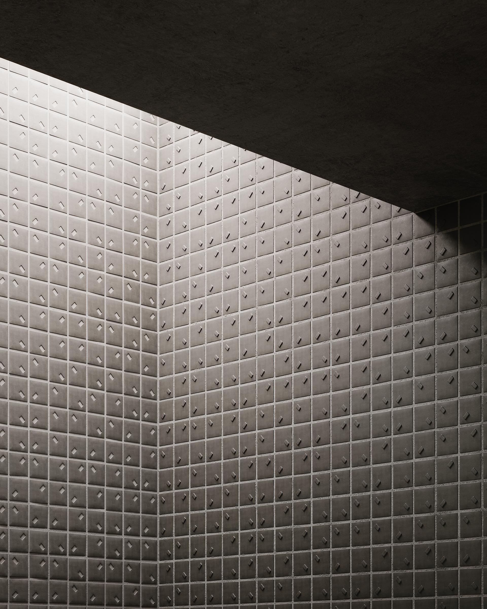 Das grafische Element ist asymmetrisch angeordnet, um die natürliche Zufälligkeit des Regens zu evozieren. Rain ist in Mosaiksteinen von 25 × 25 mm mit hohem und niedrigem Relief erhältlich.