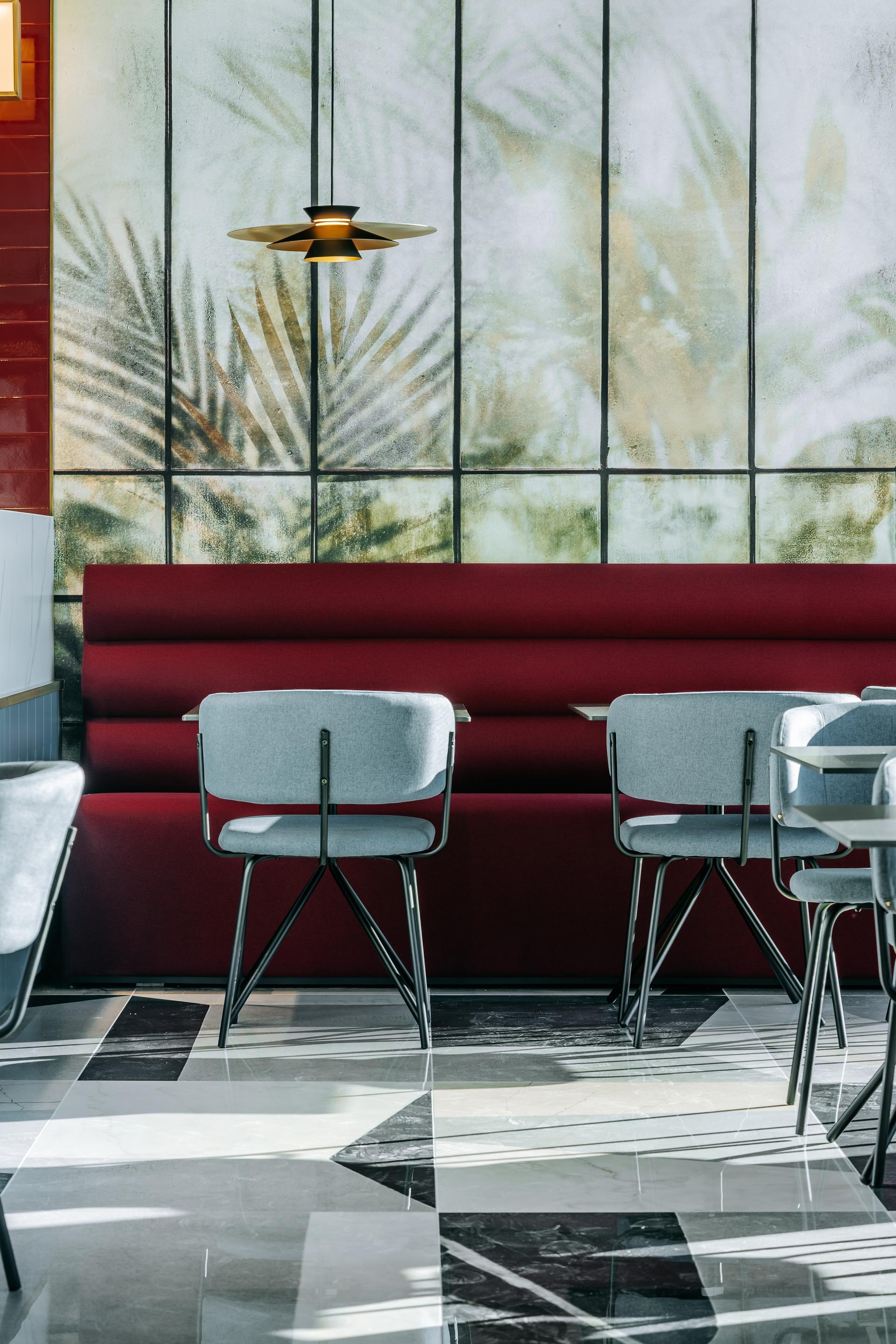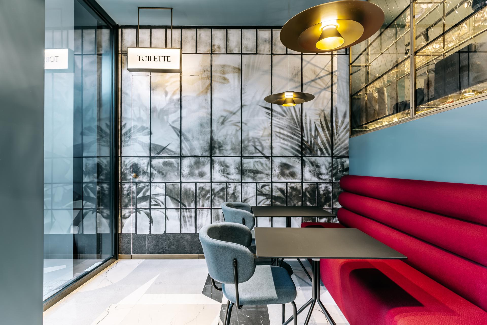 As for the standout features of the makeover, Claudia Lenti continues: “We completely clad the interiors with bespoke wood panelling, lacquered in a sugar-paper blue, and created contrast by finishing the pizzeria area in small-format tiles in a distinctive brick-red shade. To tie everything together into a cohesive whole, we introduced jungle-style wallpaper inserts and brass details.” The flooring also plays a crucial role. “I wanted a marble look with something a little different from the usual effects, and ultimately chose the Sound of Marble collection from Ceramica Fioranese,” says the interior designer. These marble-effect porcelain stoneware tiles, chosen in the FioMood finish, create a lively interplay of lines and shapes by combining cuts, diagonals and curves, along with unexpected colour combinations that form compositions with a design that is anything but predictable. “Thanks to its mix of geometry and colour, the collection proved to be the perfect match for the eclectic character of Zacapa Food & Drink,” Lenti concludes.