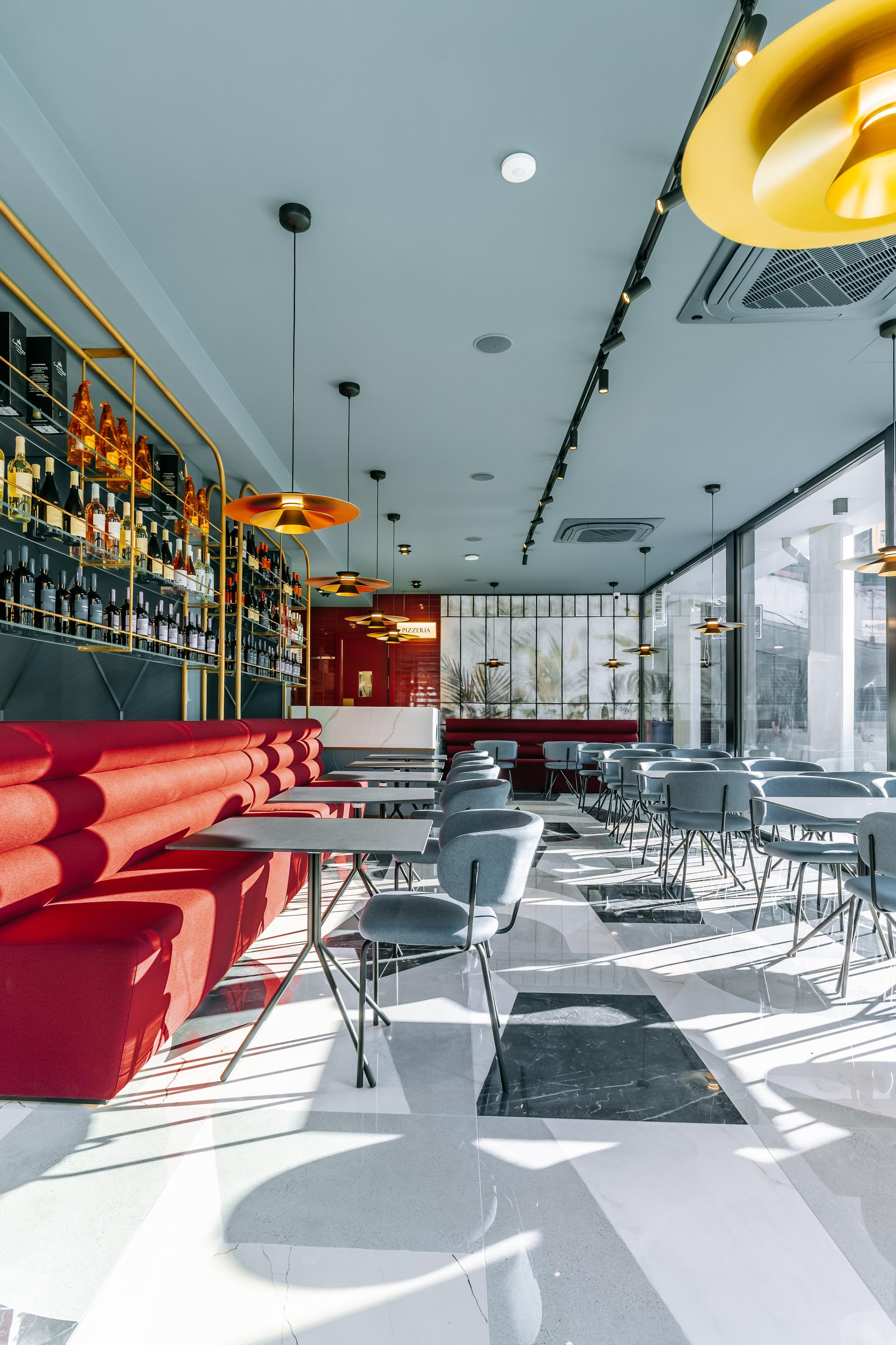 Open from early morning for breakfast and continuing throughout the day with aperitifs, lunch and dinner, the restaurant’s schedule had a decisive influence on the new layout and furnishings. “For this project, I envisioned a glamorous, sophisticated setting in line with the range of services offered to customers,” explains interior designer Claudia Lenti from Scalera Group. “The venue is divided into several areas, including a bar, pastry shop and delicatessen – complete with a small, partially-concealed space for quick food preparation – and a centrally positioned pizzeria.”