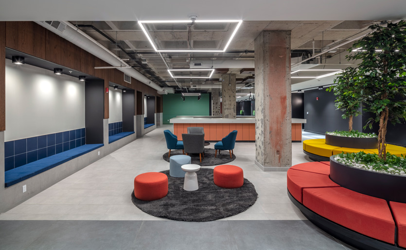 Located in the old NYNEX building in downtown Syracuse, 300 East Washington Street is a 130-unit multi-family residential development featuring lively interiors by STUDIOSC. Challenged with the constraints of working within an existing structure, the firm situated the apartments around the perimeter while placing the building’s amenities near the core. With the innermost spaces devoid of natural light, the firm used artificial lighting, playful use of color, and tiles from Mirage’s Glocal collection in a variety of formats and shades to help create vibrant programmatic areas throughout the public spaces.