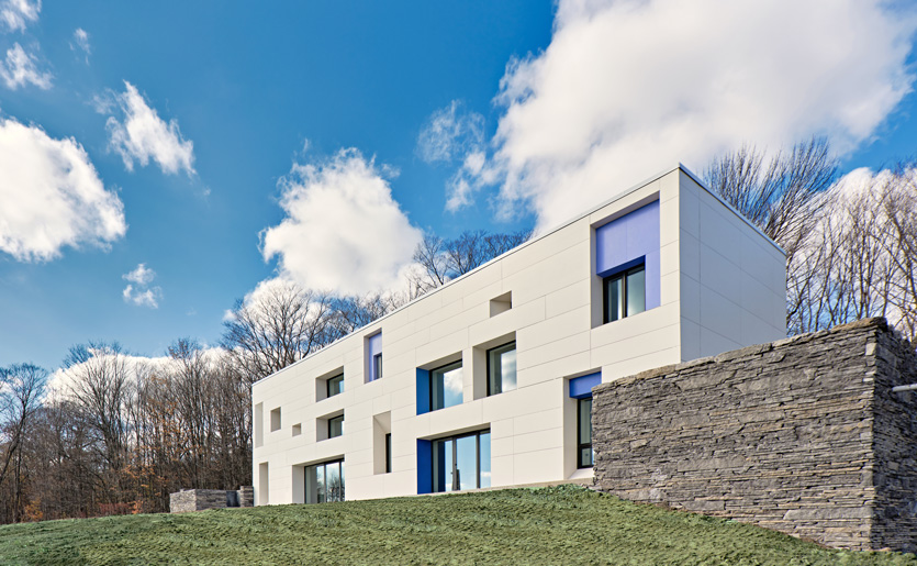 Set in the bucolic landscape of Prince Edward County in Ontario, the Endymion Guesthouse is a three-level, multi-generational house designed for the owners’ visiting family, friends and guests. It luxuriates in the landscape, the environment, and the climate of the locale, offering a quiet bower for besotted guests. Designed by Kearns Mancini Architects Inc. using the latest Passive House practices, the guesthouse offers its residents a healthy, energy-efficient and cost-saving way of living. Porcelain tile from Laminam’s Neve collection in a 3.5mm thickness offered the lightest, strongest and most beautiful cladding option, allowing the firm to create a ventilated rainscreen wall while avoiding any thermal bridging.