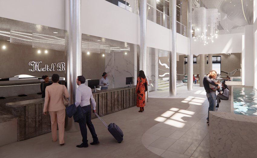 Situated close to the St. Lawrence River in Montreal, interior design student Nivedhitha Ravi designed Hotel Rivera as a boutique luxury setting intended to integrate the riverfront and rustic urbanity of Old Montreal into each space. Desiring a versatile palette of material effects, Nivedhitha selected a myriad of Italian tiles from Caesar, Ceramiche Refin, ABK, Alfa Lux, and Level, mixing glossy marble and travertine looks with rough stone texture effects to achieve the overall vision. Featuring a thoughtfully-curated lounge, spa, restaurant and reception area, each space creates a compelling contrast between water and urban, reflective and rustic, smooth and tactile, and organic and linear, while powerfully showcasing the versatile nature of Italian tile.